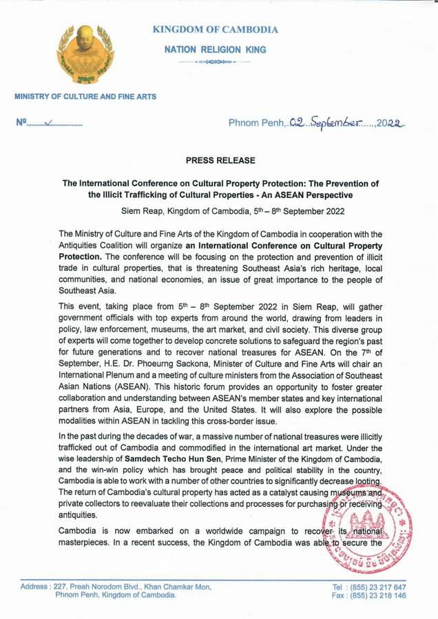 រាជធានីភ្នំពេញ៖ យោងតាមការចុះផ្សាយរបស់ ក្រសួងព័ត៌មាន នៅថ្ងៃទី០៣ ខែកញ្ញា ឆ្នាំ២០២២ បានឱ្យដឹងថា ក្រសួងវប្បធម៌ សហការជាមួយអង្គការ Antiquities Coalition នឹងរៀបចំសន្និសីទអន្តរជាតិស្តីពីការការពារសម្បត្តិវប្បធម៌ “ការទប់ស្កាត់អំពើជួញដូរសម្បត្តិវប្បធម៌ដោយខុស ច្បាប់ទស្សនៈវិស័យអាស៊ាន” ចាប់ពីថ្ងៃទី៥-៨ ខែកញ្ញា ឆ្នាំ២០២២ នៅខេត្តសៀមរាបដើម្បីផ្តល់ឱកាសក្នុងការពង្រឹងកិច្ចសហការ និងការយោគយល់គ្នាកាន់តែប្រសើរថែមទៀតរវាងប្រទេសសមាជិកអាស៊ាន និងប្រទេសជាដៃគូអន្តរជាតិសំខាន់ៗ មកពីអាស៊ីអឺរ៉ុប និងសហរដ្ឋ អាមេរិក។