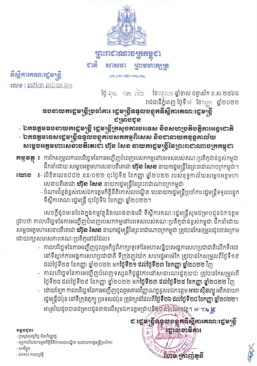 កាលបរិច្ឆេទ នៃការអញ្ជើញបំពេញទស្សនកិច្ចផ្លូវការនៅសាធារណរដ្ឋគុយបា ត្រូវបានកែសម្រួលពីថ្ងៃទី២៥ ដល់ថ្ងៃទី២៩ ខែកញ្ញា ឆ្នាំ២០២២ មកថ្ងៃទី២៣ ដល់ថ្ងៃទី២៥ ខែកញ្ញា ឆ្នាំ២០២២ វិញ ដោយឡែក កាលបរិច្ឆេទនៃការអញ្ជើញចូលរួមគោរពវិញ្ញាណក្ខន្ធសពឯកឧត្តម អាបេ ស៊ីនហ្សូ អតីតនាយករដ្ឋមន្ត្រីជប៉ុន នៅទីក្រុងតូក្យូ ប្រទេសជប៉ុន ត្រូវរក្សាដដែលគឺថ្ងៃទី២៦ ដល់ថ្ងៃទី២៨ ខែកញ្ញា ឆ្នាំ២០២២៕