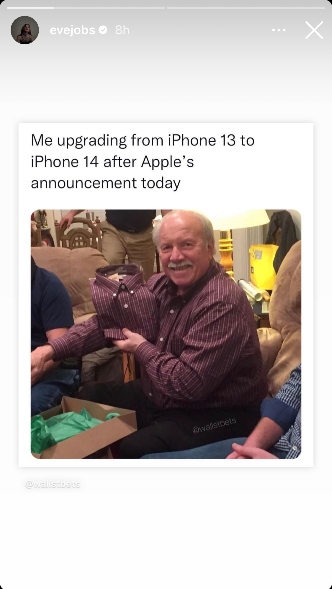យោងតាមការចុះផ្សាយរបស់សារព័ត៌មាន Daily Mail បានឱ្យដឹងថា កូនស្រីរបស់ Steve Jobs គឺនាង Eve បានចំអកឱ្យ Apple ចំពោះការបង្ហាញ iPhone 14 ស៊េរីថ្មី ដោយការបង្ហោះអ៉ីនធឺណិត meme នៅលើបណ្ដាញសង្គមរបស់នាង។ នាង Eve Jobs ដែលមានអាយុ ២៣ឆ្នាំ បានឆ្លើយតបភ្លាមៗទៅលើការប្រកាសរបស់ក្រុមហ៊ុន Apple កាលពីថ្ងៃពុធ (ម៉ោងនៅអាមេរិក) បូករួមជាមួយនឹងរូបភាព meme មួយដែលសរសេរថា៖«ខ្ញុំអាប់ដេតពី iPhone 13 ទៅ iPhone 14 បន្ទាប់ពីការប្រកាសរបស់ Apple» ខណៈនៅក្នុងរូបភាពនោះផងដែរ គឺមានរូបមនុស្សពាក់អាវក្រឡា ហើយដៃរបស់គាត់ មានកាន់អាវក្រឡាដូចគ្នាបេះដាក់ទៅនឹងអាវដែលគាត់កំពុងពាក់។