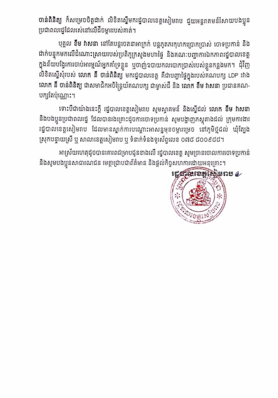 រដ្ឋបាលខេត្តបានបន្តថា ស្វាគមន៍ និងស្នើដល់ លោក ខឹម វាសនា និងបងប្អូនប្រជាពលរដ្ឋ ដែលបានរងគ្រោះដូចការចោទប្រកាន់ សូមបង្ហាញភស្តុតាងដល់ក្រុមការងាររដ្ឋបាលខេត្តសៀមរាប ដែលមានស្នាក់ការបណ្តោះអាសន្នមុខចម្ការម្រេច នៅភូមិថ្មជល់ ឃុំត្បែង ស្រុកបន្ទាយស្រី ឬ សាលាខេត្តសៀមរាប ឬ ទំនាក់ទំនងទូរស័ព្ទលេខ ០៧៨ ៨០០៩៨៨។ ព័ត៌មានលម្អិតសូមអានសេចក្តីប្រកាសព័ត៌មានដូចខាងក្រោម៖