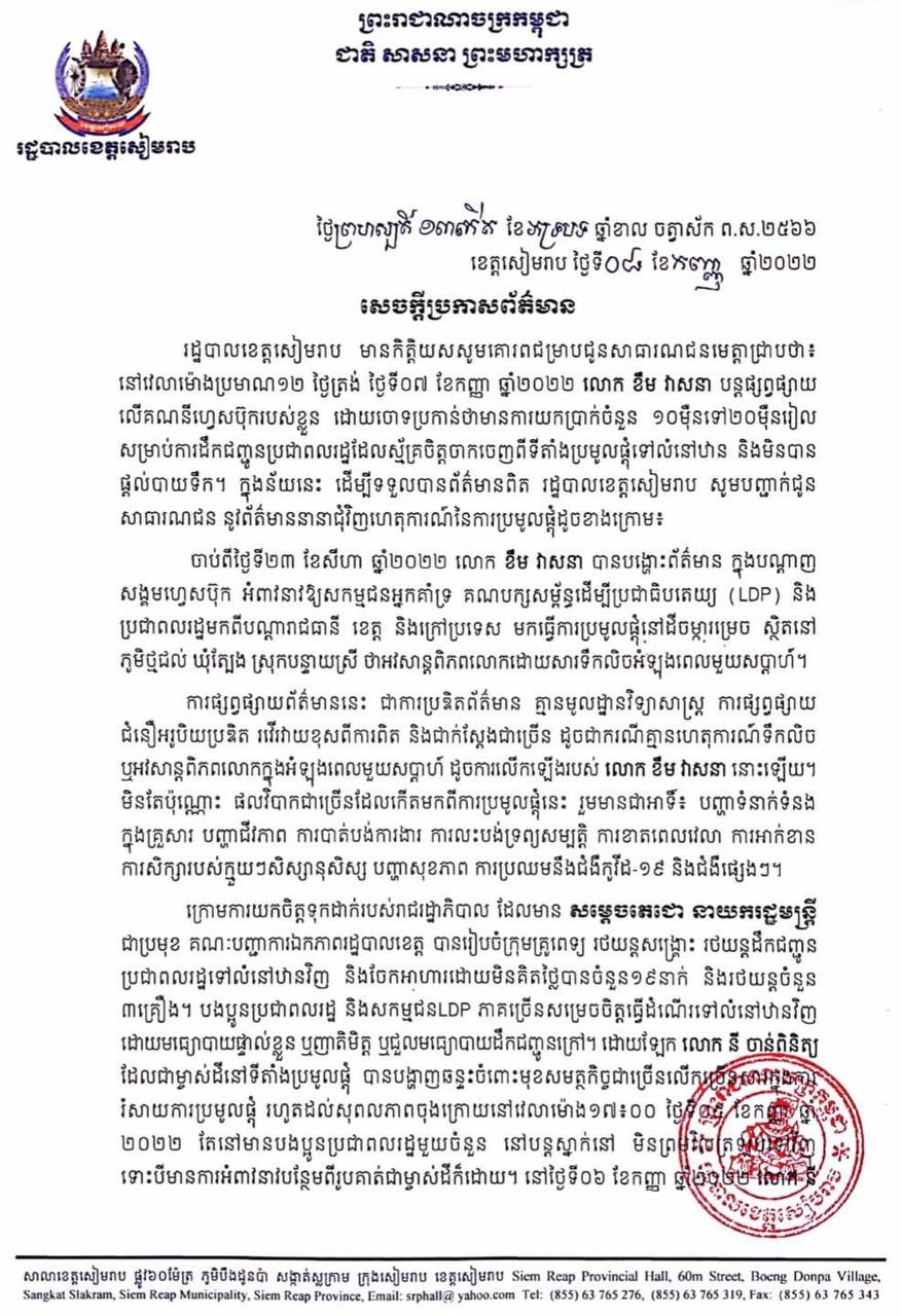 រដ្ឋបាលខេត្តសៀមរាប នៅយប់ថ្ងៃទី០៨ ខែកញ្ញា ឆ្នាំ២០២២នេះ បានចេញសេចក្តីប្រកាសច្រានចោលទាំងស្រុងចំពោះការចោទប្រកាន់របស់លោក ខឹម វាសនា ដែលបានបន្តផ្សព្វផ្សាយលើគណនីហ្វេសប៊ុករបស់ខ្លួន ដោយចោទប្រកាន់ថាមានការយកប្រាក់ចំនួន ១០ម៉ឺនទៅ២០ម៉ឺនរៀលសម្រាប់ការដឹកជញ្ជូនប្រជាពលរដ្ឋដែលស្ម័គ្រចិត្តចាកចេញពីទីតាំងប្រមូលផ្តុំទៅលំនៅឋាន និងមិនបានផ្តល់បាយទឹក។