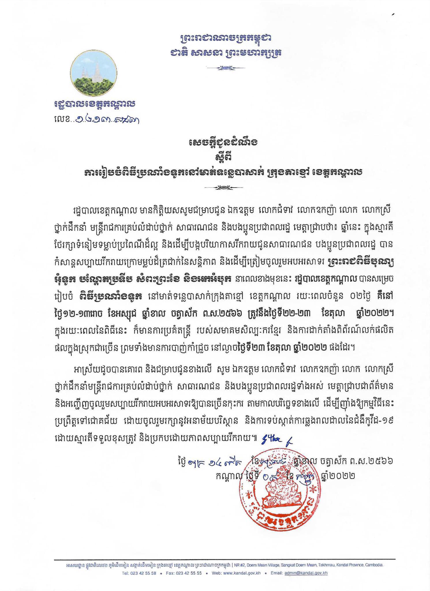 អាស្រ័យដូចបានជម្រាបជូនខាងលើ សូមសាធារណជនទាំងអស់ និងបងប្អូនប្រជាពលរដ្ឋ មេត្តាជ្រាបជាព័ត៌មាន និងអញ្ជើញចូលរួមសប្បាយរីករាយអបអរសាទរឱ្យបានច្រើនកុះករ តាមការបរិច្ឆេទខាងលើ ដើម្បីញ៉ាំងឱ្យកម្មវិធីនេះ ប្រព្រឹត្តទៅជោគជ័យ ៕