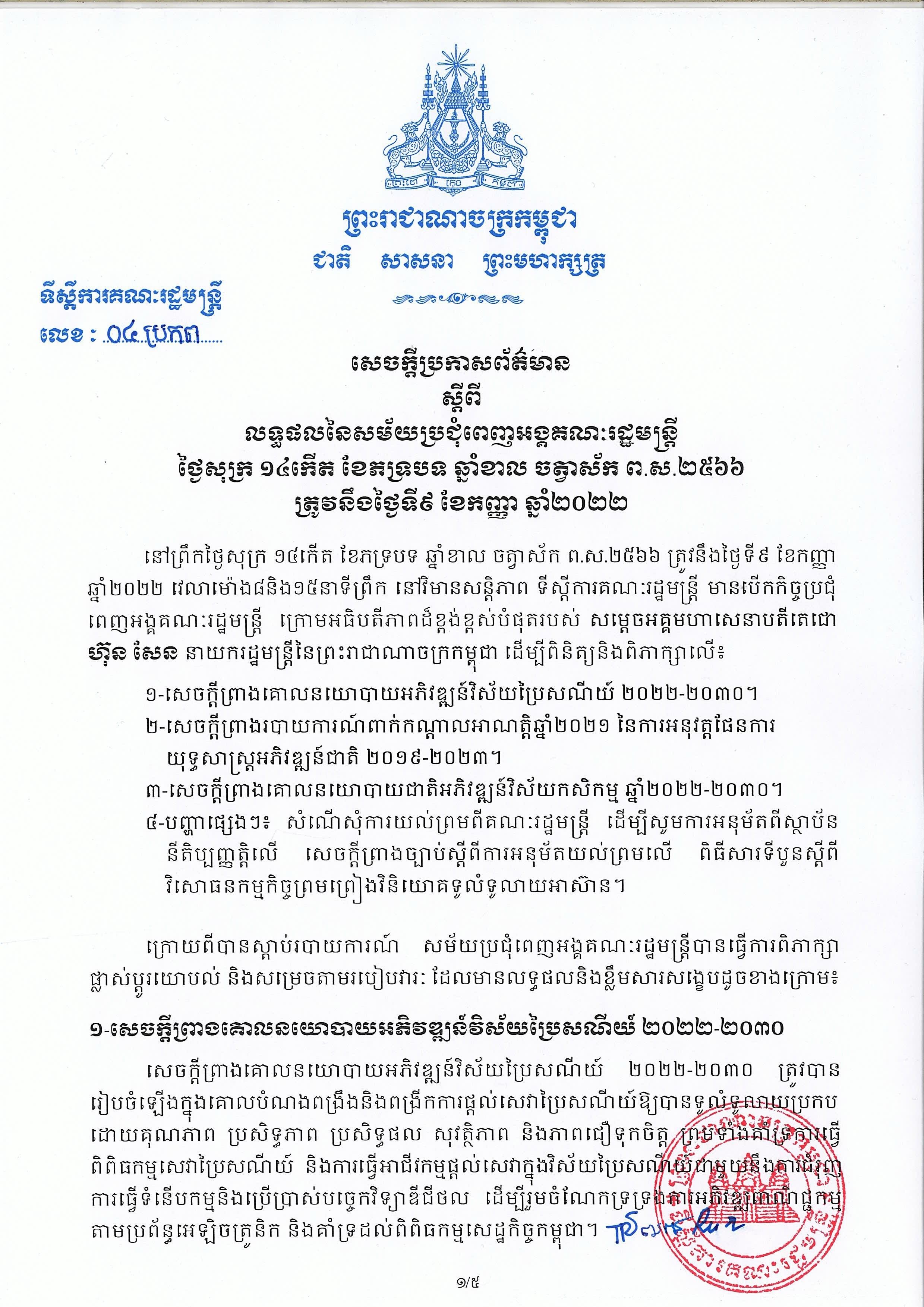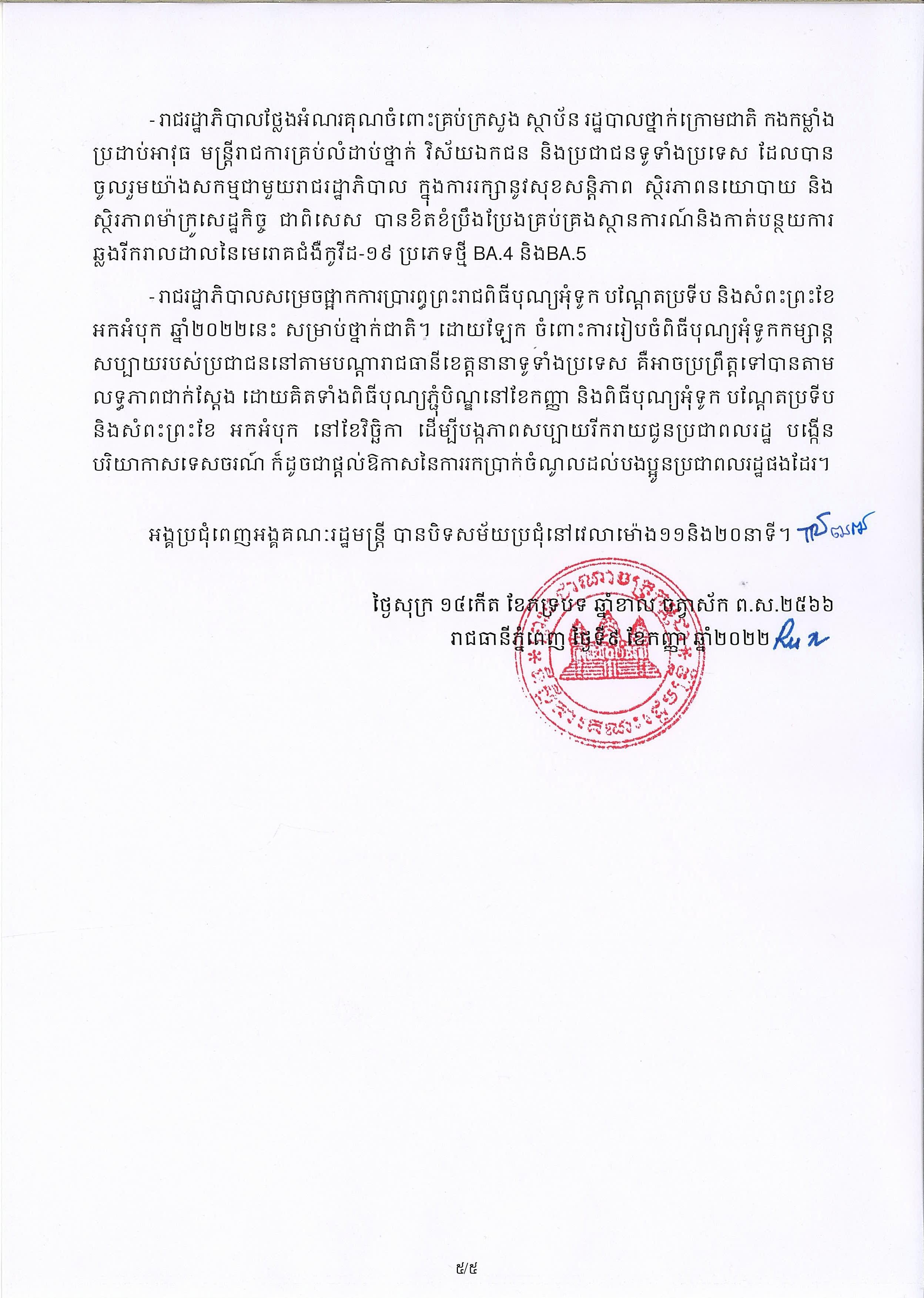 យោងតាមលទ្ធផលនៃសម័យប្រជុំពេញអង្គគណៈរដ្ឋមន្ត្រី ថ្ងៃសុក្រ ១៤កើត ខែភទ្របទ ឆ្នាំខាល ចត្វាស័ក ព.ស.២៥៦៦ ត្រូវនឹងថ្ងៃទី០៩ ខែកញ្ញា ឆ្នាំ២០២២ បានឲ្យដឹងថា រាជរដ្ឋាភិបាលសម្រេចផ្អាកការប្រារព្ធព្រះរាជពិធីបុណ្យអុំទូក បណ្តែតប្រទីប និងសំពះព្រះខែ អកអំបុក ឆ្នាំ២០២២នេះ សម្រាប់ថ្នាក់ជាតិ។