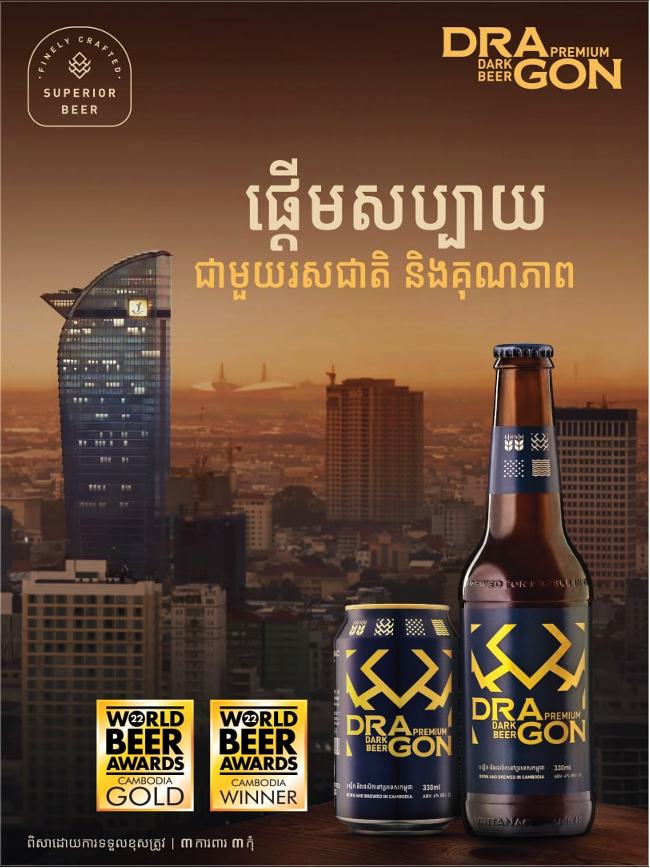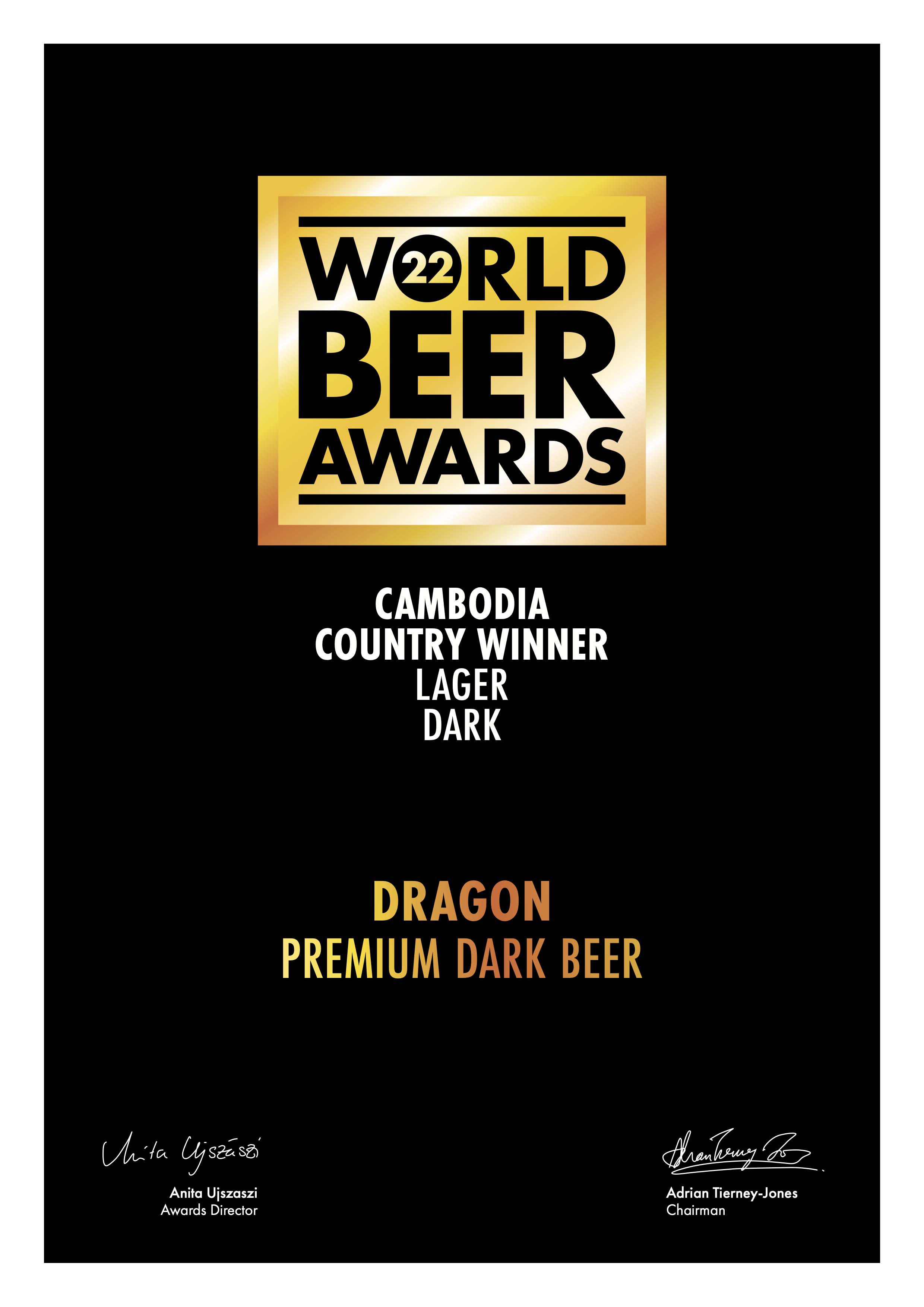 ស្រាបៀរប្រណិតទឹកខ្មៅ ដ្រាហ្គិន ព្រីមៀមដាកបៀរ ឈ្នះពានរង្វាន់ពីរផ្ទួនគ្នា ពីកម្មវិធីស្រាបៀរលំដាប់ពិភពលោក Word Beer Awards ឆ្នាំ២០២២