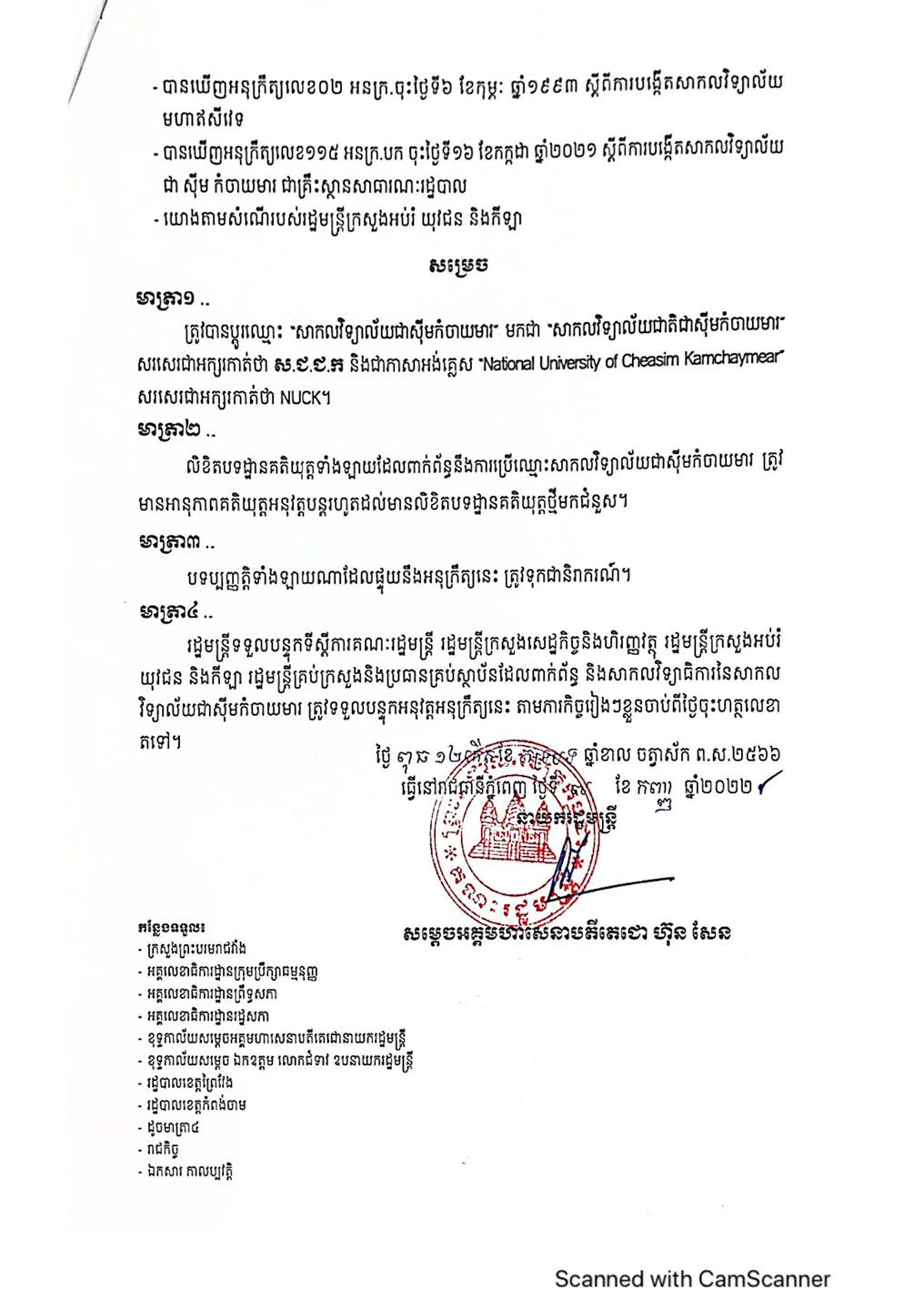 រាជរដ្ឋាភិបាលកម្ពុជា បានសម្រេច ត្រូវប្ដូរឈ្មោះ “សាកលវិទ្យាល័យ ជា ស៊ីម កំចាយមារ” មកជា “សាកលវិទ្យាល័យជាតិ ជា ស៊ីម កំចាយមារ” សរសេរជាអក្សរកាត់ថា ស.ជ.ជ.ក និងជាភាសាអង់គ្លេស “National University of Chea Sim Kamchaymear” សរសេរជាអក្សរកាត់ថា NUCK វិញ តាមអនុក្រឹត្យរបស់រាជរដ្ឋាភិបាលកម្ពុជា លេខ ១៨៣ អនក្រ.បក ចុះថ្ងៃទី៧ ខែកញ្ញា ឆ្នាំ២០២២ ៕