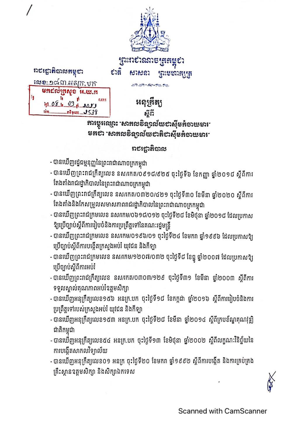 រាជរដ្ឋាភិបាលកម្ពុជា ចេញអនុក្រឹត្យប្តូរឈ្មោះសាកលវិទ្យាល័យ ជា ស៊ីម កំចាយមារ ប្តូរមកជា សាកលវិទ្យាល័យជាតិ ជា ស៊ីម កំចាយមារ វិញ
