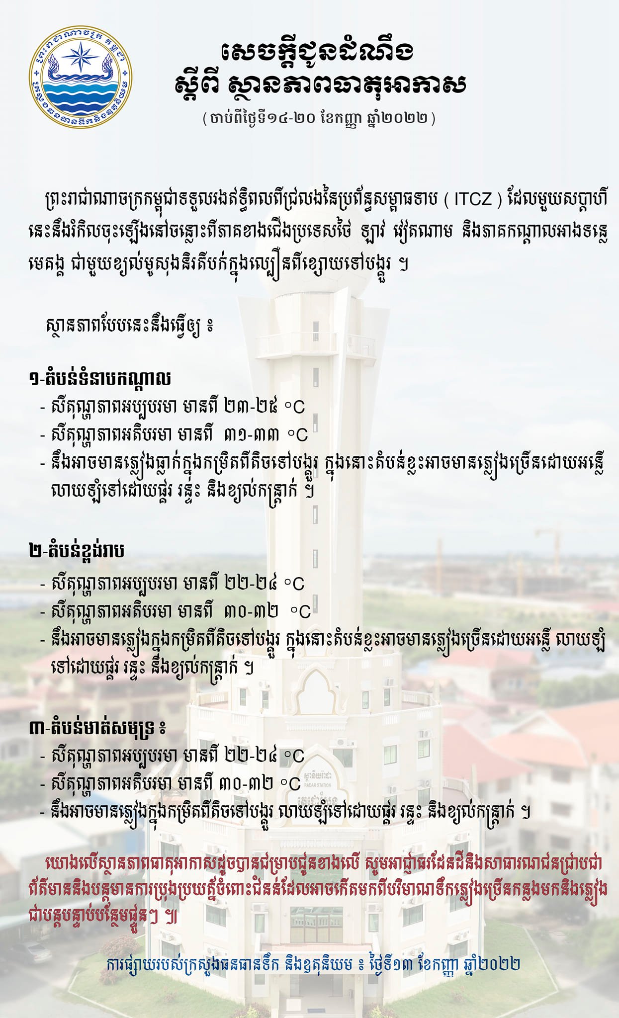 រាជធានីភ្នំពេញ៖ យោងតាមការចុះផ្សាយរបស់ ក្រសួងធនធានទឹក និងឧតុនិយម នៅថ្ងៃទី១៣ ខែកញ្ញា ឆ្នាំ២០២២ បានចេញសេចក្ដីជូនដំណឹងស្ដីពីស្ថានភាពធាតុអាកាស ចាប់ពីថ្ងៃទី១៤ ដល់ថ្ងៃទី២០ ខែកញ្ញា ឆ្នាំ២០២២ បានឱ្យដឹងថា៖