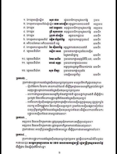 រាជធានីភ្នំពេញ៖ យោងតាមការចុះផ្សាយរបស់ ទូរទស្សន៍ជាតិកម្ពុជា ទទក បានឱ្យដឹងថា នៅថ្ងៃទី១៦ ខែកញ្ញា ឆ្នាំ២០២២ សម្តេចអគ្គមហាសេនាបតីតេជោ ហ៊ុន សែន នាយករដ្ឋមន្ត្រីនៃព្រះរាជាណាចក្រកម្ពុជា បានចុះហត្ថលេខាលើសេចក្តីសម្រេចបង្កើតក្រុមការងារបង្ក្រាបការលេងល្បែងស៊ីសងពិសេសខុសច្បាប់គ្រប់ប្រភេទ នៅទូទាំងប្រទេស ដែលមានប្រធាន អនុប្រធាន និងសមាជិកសរុប ១២រូប ក្នុងនោះ ឯកឧត្តមសន្តិបណ្ឌិត សុខ ផល រដ្ឋលេខាធិការក្រសួងមហាផ្ទៃ ជាប្រធាន។