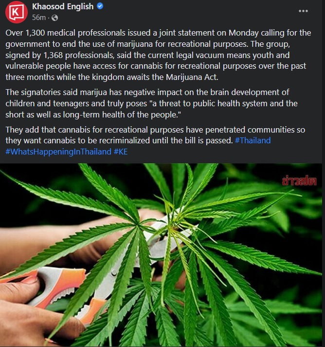 យោងតាមការបង្ហោះនៅលើហ្វេសប៊ុកដោយ Khaosod បានឱ្យដឹងថា អ្នកជំនាញវេជ្ជសាស្រ្តថៃជាង ១,៣០០ នាក់ បានចេញសេចក្តីថ្លែងការណ៍រួមមួយនៅថ្ងៃចន្ទនេះផ្ទាល់ ដោយអំពាវនាវឱ្យរដ្ឋាភិបាលបញ្ចប់ការប្រើប្រាស់កញ្ឆា សម្រាប់គោលបំណងកម្សាន្តអារម្មណ៍។ សេចក្តីថ្លែងការណ៍ដែលចុះហត្ថលេខាដោយអ្នកជំនាញចំនួន ១,៣៦៥ នាក់ បានបញ្ជាក់ថា ភាពមិនទាន់ច្បាស់លាស់ផ្នែកច្បាប់នាពេលបច្ចុប្បន្ននេះ បានអនុញ្ញាតឱ្យយុវជន និងជនដែលងាយរងគ្រោះ មានសិទ្ធិប្រើប្រាស់កញ្ឆាដោយសេរីក្នុងរយៈពេល ៣ ខែចុងក្រោយនេះ ខណៈដែលប្រទេសនេះកំពុងរង់ចាំច្បាប់ពាក់ព័ន្ធនឹងកញ្ឆាផ្លូវការមួយ។