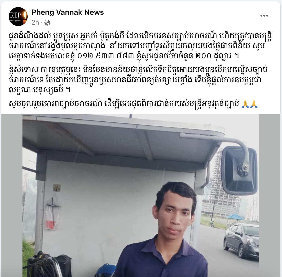 “ជូនដំណឹងដល់ ប្អូនប្រុស អ្នករត់ ម៉ូតូកង់បី ដែលបេីកបរខុសច្បាប់ចរាចរណ៍ ហើយត្រូវបានមន្ត្រីចរាចរណ៍នៅរង្វង់មូលគួចកាណុង នាំយកទៅបញ្ចាំទូរស័ព្ទយកលុយបង់ថ្លៃផាកពិន័យ សូមមេត្តាទាក់ទងមកលេខខ្ញុំ ០១២ ៩៣៣ ៨៨៣ ខ្ញុំសូមជូនថវិកាចំនួន ២០០ ដុល្លារ ។ ខ្ញុំសុំទោស ការឧបត្ថម្ភនេះ មិនមែនមានន័យថាខ្ញុំលេីកទឹកចិត្តអោយបងប្អូនបេីកបរល្មេីសច្បាប់ចរាចរណ៍ទេ តែដោយឃេីញប្អូនប្រុសមានជីវភាពខ្សត់ខ្សោយខ្លាំង ទេីបខ្ញុំផ្ដល់ការឧបត្ថម្ភជាលក្ខណៈមនុស្សធម៌” ។