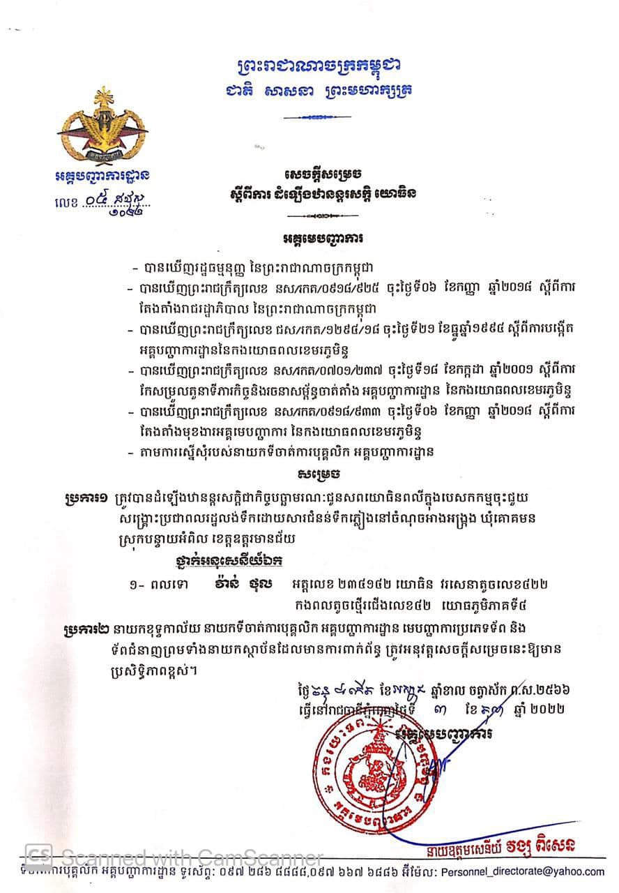 យោងតាមការបង្ហោះរបស់ អគ្គមេបញ្ជាការ កងយោធពលខេមរភូមិន្ទ បានឱ្យដឹងថា តបស្នងចំពោះការធ្វើពលិកម្មដ៏ធំធេងរបស់យុទ្ធជនពីររូប នៅក្នុងបេសកកម្មចុះជួយសង្គ្រោះប្រជាពលរដ្ឋលង់ទឹកដោយសារជំនន់ទឹកភ្លៀងនៅចំណុចអាងអង្ក្រង ឃុំគោគមន ស្រុកបន្ទាយអំពិល ខេត្តឧត្ដរមានជ័យនាពេលថ្មីៗនេះ។ នៅថ្ងៃទី០៣ ខែតុលា ឆ្នាំ២០២២នេះ អគ្គមេបញ្ជាការ នៃកងយោធពលខេមរភូមិន្ទ បានចេញសេចក្តីសម្រេចដំឡើងឋានន្តរសក្កិជាកិច្ចបច្ឆាមរណៈ ថ្នាក់អនុសេនីយ៍ឯក ជូនសពយោធិនពលី៖