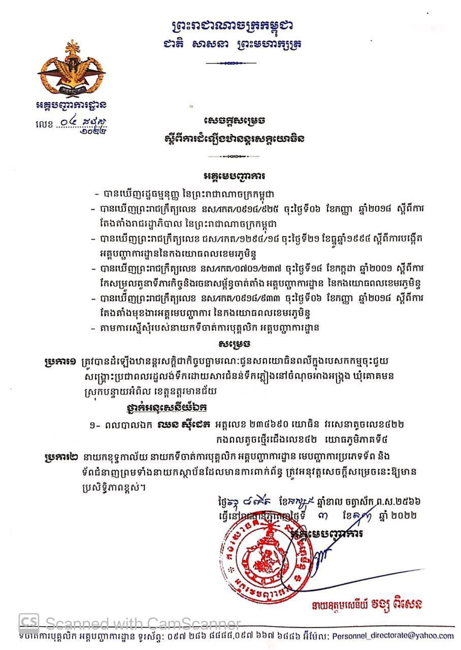 (ភ្នំពេញ)៖ អគ្គមេបញ្ជាការ កងយោធពលខេមរភូមិន្ទ ចេញសេក្ដីសម្រេចដំឡើងឋានន្តរសក្កិជាកិច្ចបច្ឆាមរណៈថ្នាក់អនុសេនីយ៍ឯក ជូនដល់សពយោធិនពីររូបដែលពលីក្នុងបេសកកម្មជួយសង្គ្រោះប្រជាជនលង់ទឹកជំនន់ទឹកភ្លៀង។