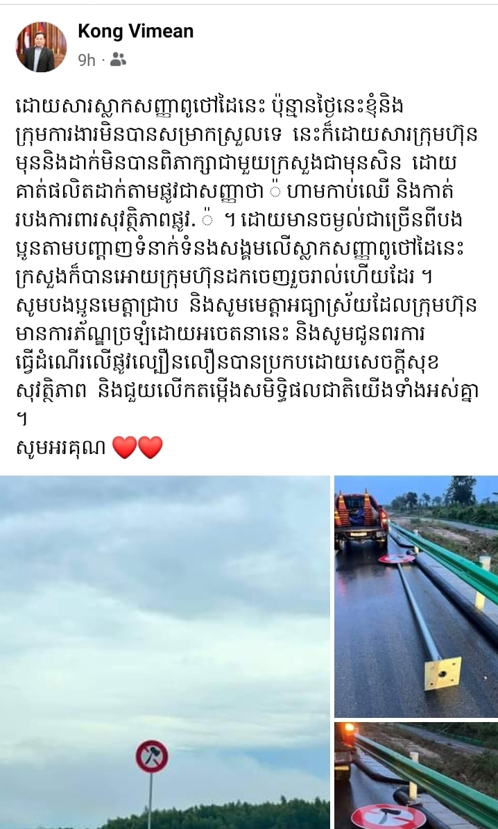 ដោយសារស្លាកសញ្ញាពូថៅដៃនេះ ប៉ុន្មានថ្ងៃនេះខ្ញុំនិងក្រុមការងារមិនបានសម្រាកស្រួលទេ នេះក៏ដោយសារក្រុមហ៊ុនមុននិងដាក់មិនបានពិភាក្សាជាមួយក្រសួងជាមុនសិន ដោយគាត់ផលិតដាក់តាមផ្លូវជាសញ្ញាថា «ហាមកាប់ឈើ និងកាត់របងការពារសុវត្ថិភាពផ្លូវ»។ ដោយមានចម្ងល់ជាច្រើនពីបងប្អូនតាមបណ្ដាញទំនាក់ទំនងសង្គមលើស្លាកសញ្ញាពូថៅដៃនេះ ក្រសួងក៏បានអោយក្រុមហ៊ុនដកចេញរួចរាល់ហើយដែរ។
