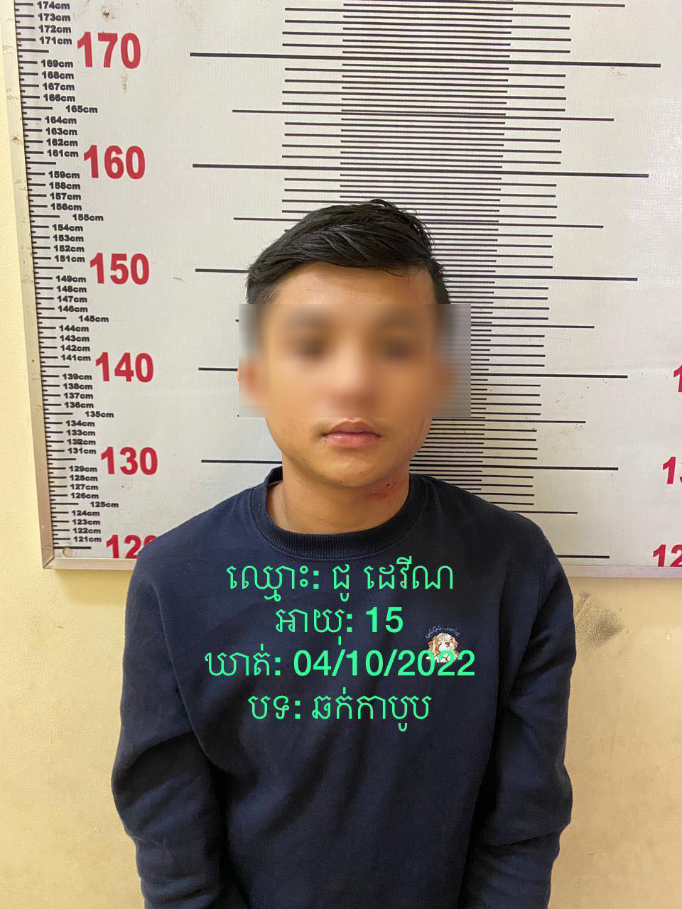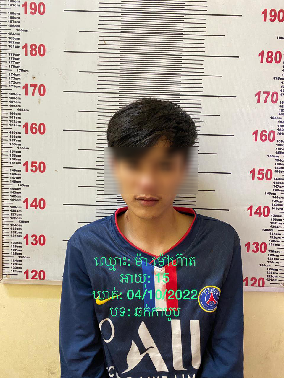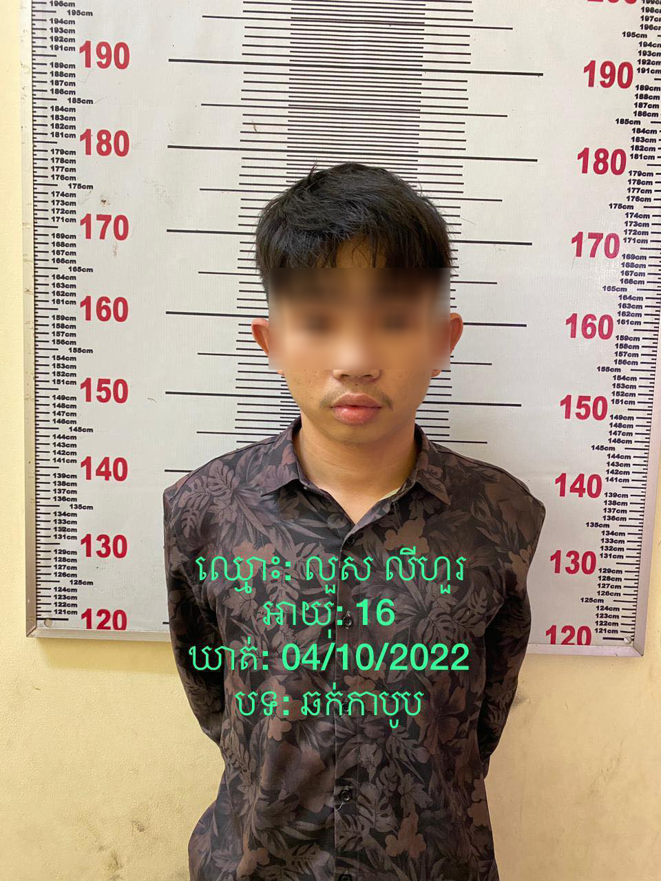 ឈ្មោះ ម៉ា ម៉ៅហ៊ាត ភេទប្រុស អាយុ១៦ឆ្នាំ ជនជាតិខ្មែរ មុខរបរមិនពិតប្រាកដ ទីកន្លែងស្នាក់នៅមិនពិតប្រាកដ ចំណែកជនសង្ស័យ០១នាក់ទៀត បានរត់គេចខ្លួន (បិទគូថ)។