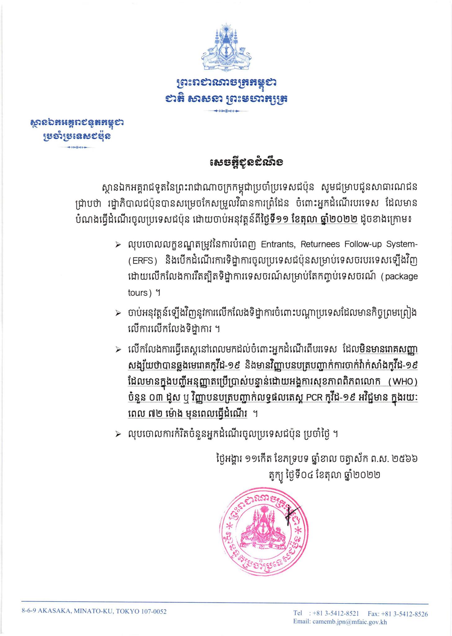 យោងតាមសេចក្តីជូនដំណឹងពី ស្ថានឯកអគ្គរាជទូតនៃព្រះរាជាណាចក្រកម្ពុជាប្រចាំប្រទេសជប៉ុន បានឲ្យដឹងថា រដ្ឋាភិបាលជប៉ុនបានសម្រេចកែសម្រួលវិធានការព្រំដែន ចំពោះអ្នកដំណើរបរទេស ដែលមានបំណងធ្វើដំណើរចូលប្រទេសជប៉ុន ដោយចាប់អនុវត្តន៍ពីថ្ងៃទី១១ ខែតុលា ឆ្នាំ២០២២ ដូចខាងក្រោម៖