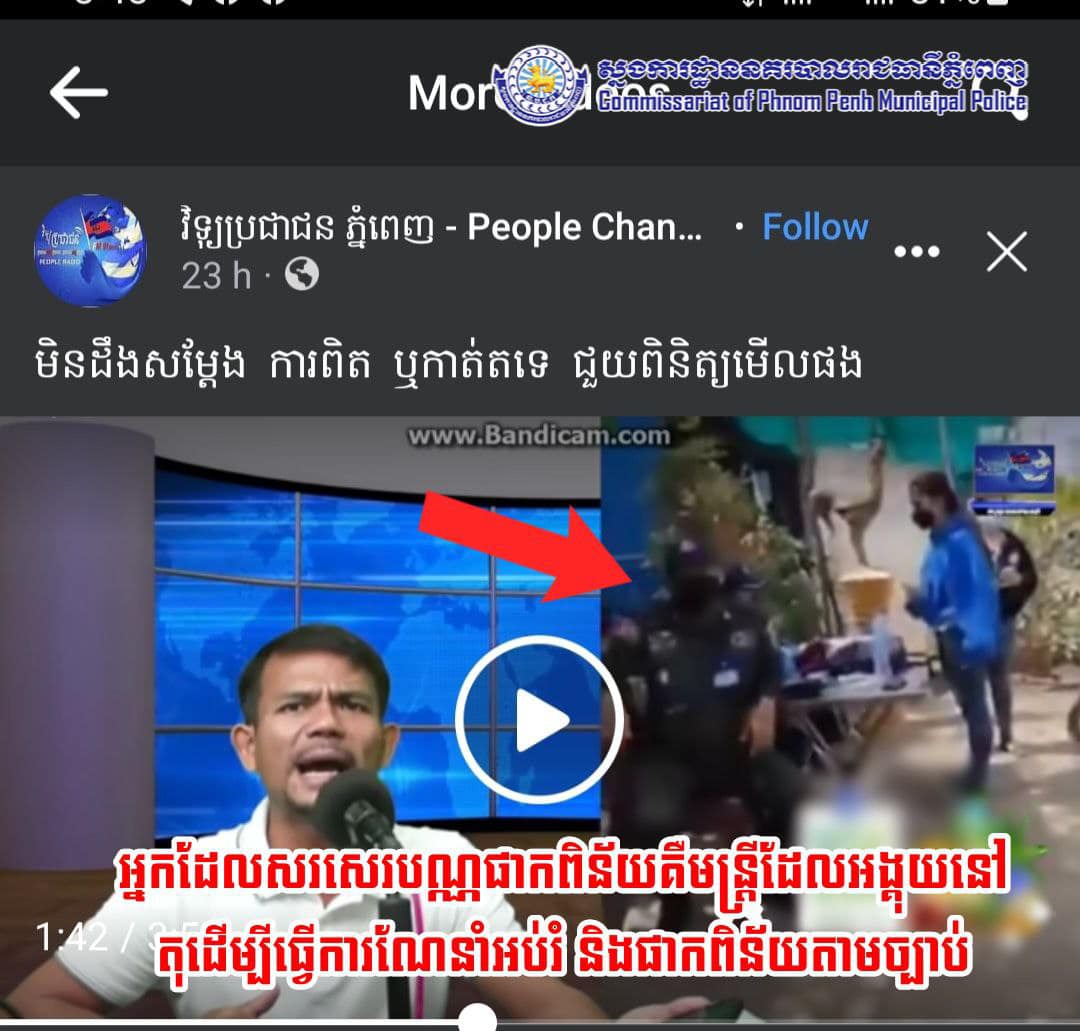 ស្នងការដ្ឋាននគរបាលរាជធានីភ្នំពេញ សូមធ្វើការបកស្រាយបំភ្លឺនិងបដិសេធចំពោះការចុះផ្សាយខុសពីការពិតចំពោះករណីនេះ ជាក់ស្តែងកាលពីខែកញ្ញា ឆ្នាំ២០២២ មន្ត្រីចរាចរណ៍ និងកម្លាំងអន្តរាគមន៍ នៃអធិការដ្ឋាននគរបាលខណ្ឌដង្កោ បានដាក់គោលដៅរឹតបន្តឹងច្បាប់ចរាចរណ៍ផ្លូវគោក ត្រង់ចំណុចស្ពានទឹកថ្លា ផ្លូវជាតិលេខ៣ សង្កាត់ក្រាំងពង្រ ខណ្ឌដង្កោ ប្រហែលជាម៉ោង០៩:០០នាទី ក៏មានបុរសម្នាក់បានបើកម៉ូតូម៉ាកហុងដាសេ១២៥ ពណ៌ខ្មៅ គ្មានផ្លាកលេខឆ្លងកាត់គោលដៅក៏សមត្ថកិច្ចហៅឲ្យឈប់ដើម្បីធ្វើការត្រួតពិនិត្យរកឯកសារផ្សេងៗ រួចមិនបានធ្វើការផាកពិន័យនោះទេ គ្រាន់តែធ្វើការណែនាំអប់រំហើយឲ្យបន្តដំណើរទៅមុខទៀត ប៉ុន្តែបុរសម្នាក់នោះមិនទាន់បានទៅភ្លាមនោះទេ ហើយក៏មាននារី០៣នាក់ ជិះម៉ូតូម៉ាកហុងដា១២៥ ពណ៌ខ្មៅ ពាក់មួកសុវត្ថិភាពចំនួន០២នាក់ គ្មានពាក់មួកសុវត្ថិភាពម្នាក់ ក៏មន្ត្រីចរាចរណ៍ហៅឲ្យឈប់ដើម្បីធ្វើការផាកពិន័យតាមច្បាប់។