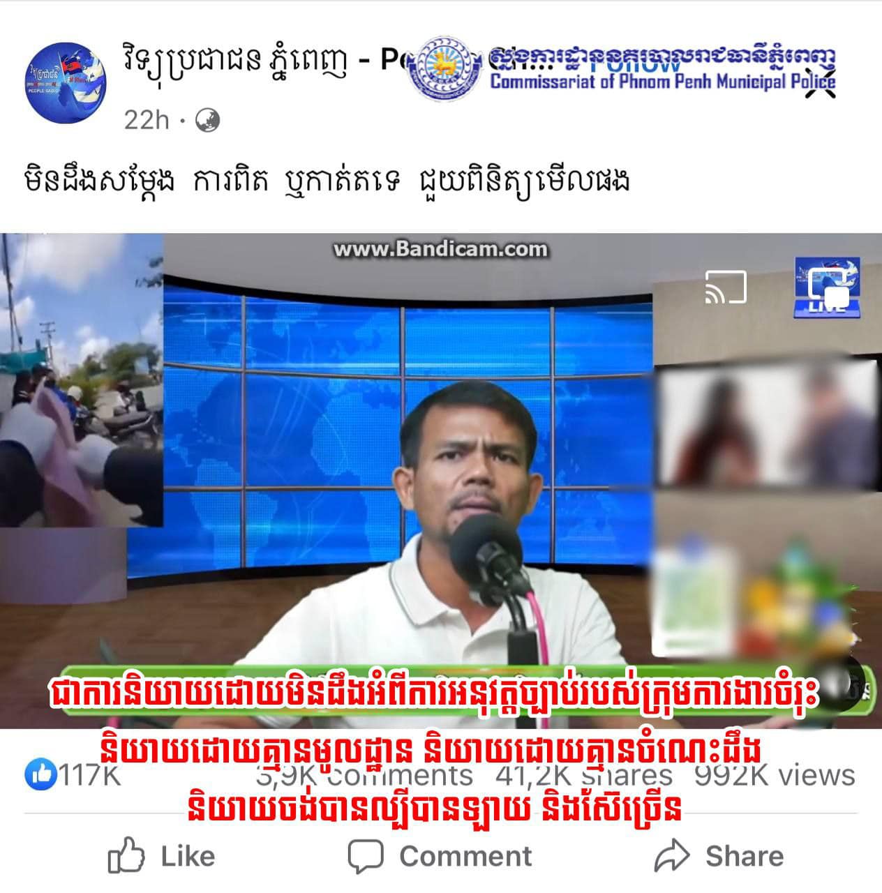 សូមបញ្ជាក់បន្ថែមដល់ការឡាយរបស់បុគ្គលជាម្ចាស់ផេក វិទ្យុប្រជាជនភ្នំពេញ ឲ្យបានដឹងច្បាស់ថា ការអនុវត្តច្បាប់ចរាចរណ៍ មិនមែនត្រឹមតែមន្ត្រីចរាចរណ៍ទេ គឺមានក្រុមការងារចំរុះរួមមានទាំងមន្ត្រីចរាចរណ៍ និងកម្លាំងអន្តរាគមន៍ ដើម្បីជួយអន្តរាគមន៍នៅពេលប៉ាតុភាពកើតឡើង ឬក្រុមល្មើសជិះរត់គេចគឺកម្លាំងចំរុះនឹងធ្វើការដេញឃាត់ដើម្បីអនុត្តតាមនីតិវិធីច្បាប់។