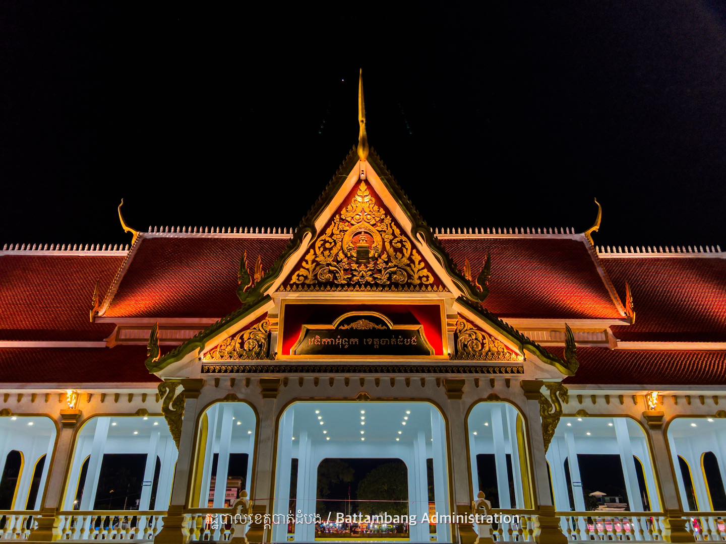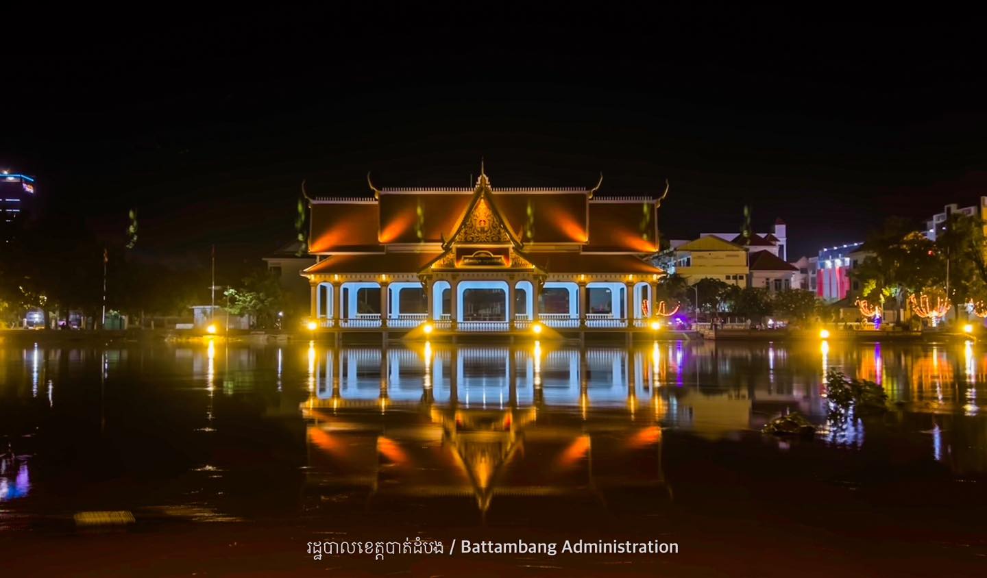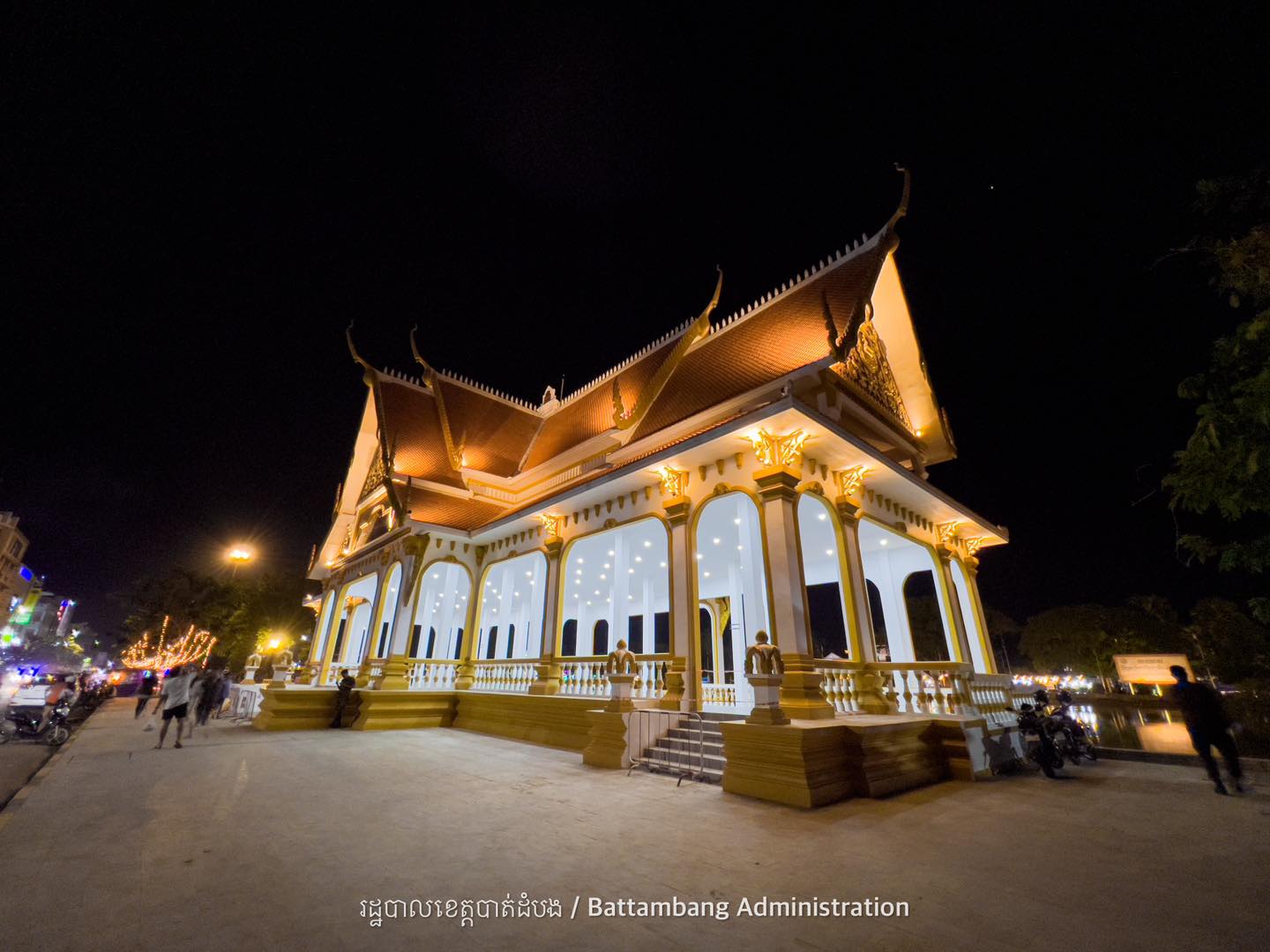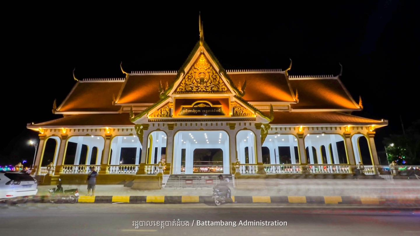 វេទិកាអុំទូកខេត្តបាត់ដំបង សង់រួចរាល់ហើយ បង្អួតសម្រស់ពេលរាត្រី ជាមួយក្បូរក្បាច់រចនាបថបែបបុរាណរបស់ខ្មែរ យ៉ាងស្រស់ស្អាត