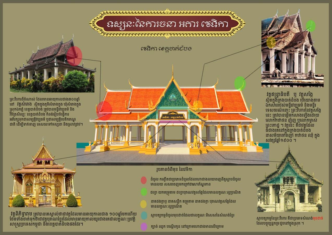 តាមមន្រ្តីជំនាញបានបញ្ជាក់ថាវេទិកាអុំទូកខេត្តបាត់ដំបងថ្មីនេះ អាចផ្ទុកមនុស្សបានប្រមាណ ៤០០ នាក់នៅពេលដែលសាងសង់រួច។ តាមទស្សនៈនៃការរចនាអគារវេទិកាអុំទូកដែលរៀបចំដោយរដ្ឋបាលខេត្តបាត់ដំបងនេះ បានបង្ហាញថា ក្បាច់រចនាបថនានារបស់ខ្មែរក្នុងសម័យបុរាណនិងសំណង់សម័យ អាណានិគមបារាំងផងដែរ ត្រូវបានយកមកផ្គុំដំឡើង ក្នុងវេទិកាដ៏ធំសម្បើមនេះ ដោយសុទ្ធសឹងតែសំរិតសំរាំងយកគំរូតាមអគារបេតិកភ័ណ្ឌ ដែលមានអាយុកាលខ្ទង់រយឆ្នាំមកបញ្ចូលគ្នា ដូចជា អគារសាលាខេត្ត ចាស់ដែលមាន អាយុ១១៧ឆ្នាំសាងសង់ក្នុងសម័យបារាំង និងសិក្សាយក លំនាំតាមទម្រង់ព្រះរាជដំណាក់ផែ មកជាទម្រង់អគារវេទិកានេះតែម្តង។