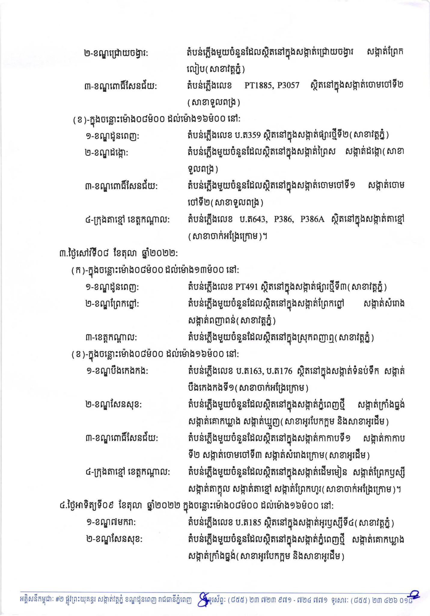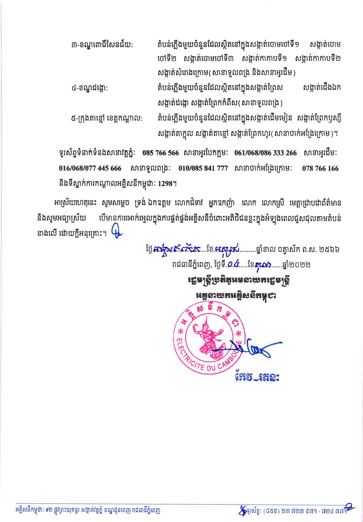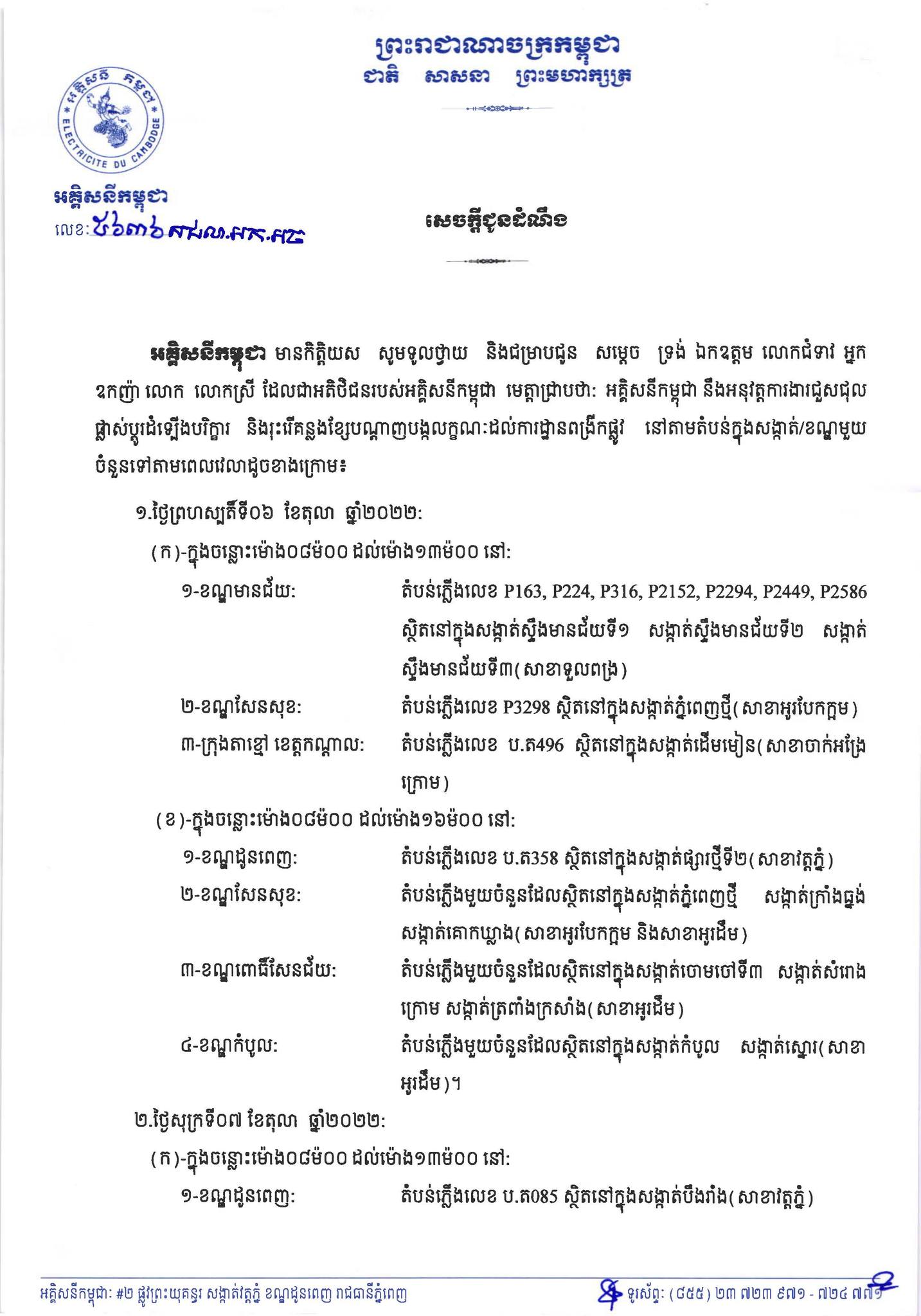 រាជធានីភំ្នពេញ៖ យោងតាមការចុះផ្សាយរបស់ អគ្គិសនីកម្ពុជា នៅថ្ងៃពុធ ១០កើត ខែអស្សុជ ឆ្នាំខាល ចត្វាស័ក ព.ស.២៥៦៦ ត្រូវនឹងថ្ងៃទី០៥ ខែតុលា ឆ្នាំ២០២២ បានចេញសេចក្តីជូនដំណឹងស្តីពីការអនុវត្តការងារជួសជុល ផ្លាស់ប្តូរតម្លើងបរិក្ខារនានា និងរុះរើគន្លងខ្សែបណ្តាញអគ្គិសនីរបស់អគ្គិសនីកម្ពុជា ដើម្បីបង្កលក្ខណៈងាយស្រួលដល់ការដ្ឋានពង្រីកផ្លូវ នៅថ្ងៃទី០៦ ខែតុលា ឆ្នាំ២០២២ ដល់ថ្ងៃទី០៩ ខែកញ្ញា ឆ្នាំ២០២២ នៅតំបន់មួយចំនួនទៅតាមពេលវេលា និងទីកន្លែងដូចសេចក្តីជូនដំណឹងលម្អិតខាងក្រោម។