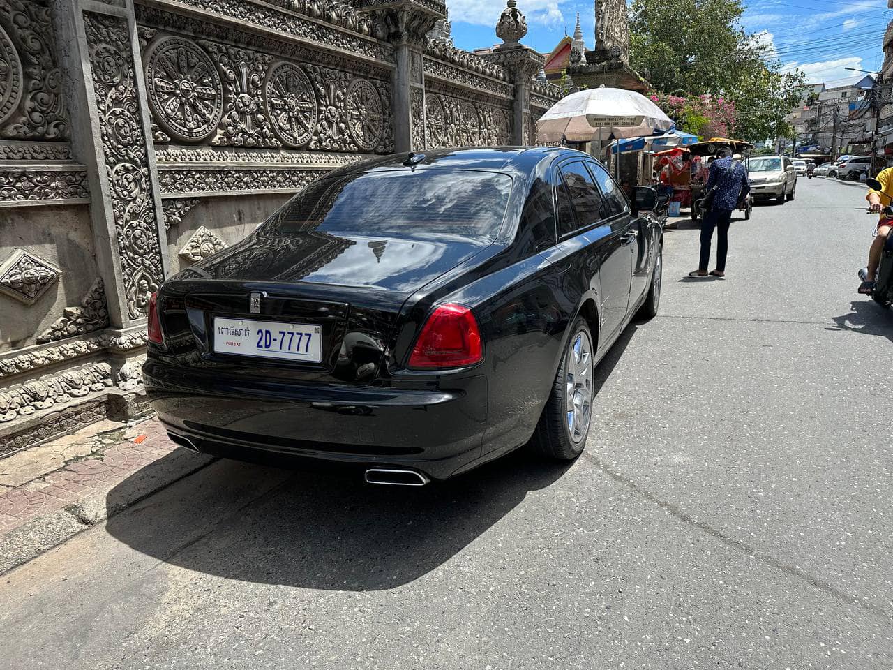រាជធានីភ្នំពេញ៖ នៅថ្ងៃទី០៥ ខែតុលា ឆ្នាំ២០២២ ករណីរថយន្ដស៊េរីទំនើប Rolls-Royce ពណ៌ខ្មៅ ពាក់ផ្លាកលេខពោធិ៍សាត់ 2D-7777 ដែលត្រូវបានម៉ូតូកង់បីកៀរបណ្ដាលឲ្យរងនូវការខូចខាតអស់មួយចំហៀងផ្នែកខាងស្ដាំនោះ ម្ចាស់រថយន្ដសម្រេចមិនយកសំណងពីភាគីកង់បីទេ។