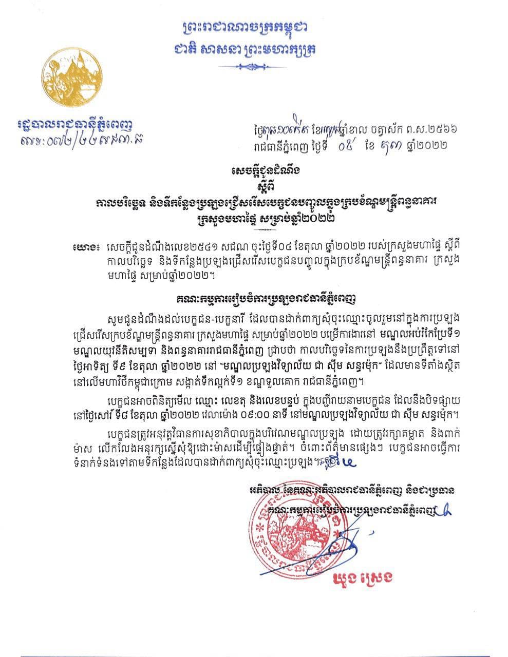 រដ្ឋបាលរាជធានីភ្នំពេញ ជូនដំណឹងពីការប្រឡងជ្រើសរើសក្របខ័ណ្ឌមន្ត្រី ពន្ធនាគារ ក្រសួងមហាផ្ទៃ សម្រាប់ឆ្នាំ២០២២