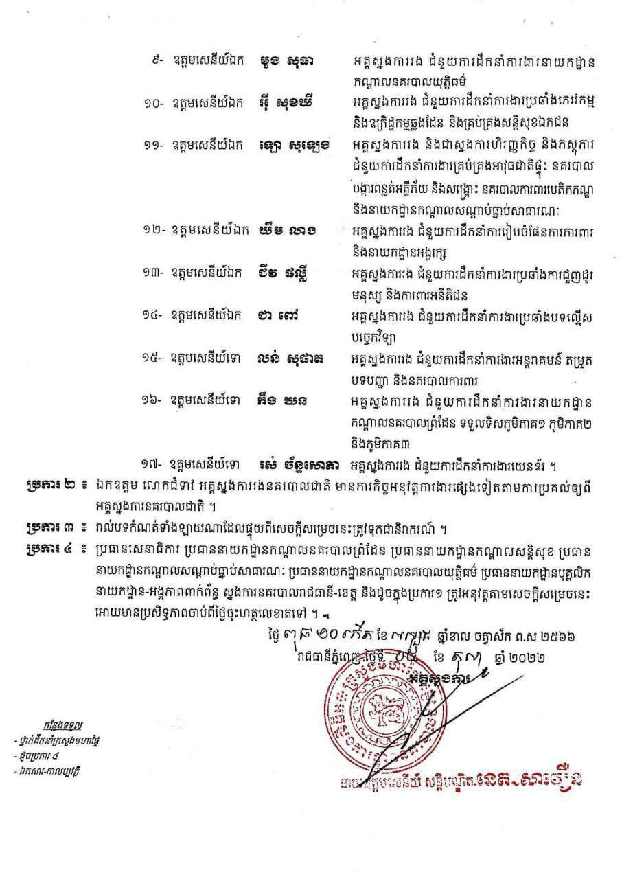 រាជធានីភ្នំពេញ៖ យោងតាមការចុះផ្សាយរបស់ ក្រសួងព័ត៌មាន នៅថ្ងៃទី០៦ ខែតុលា ឆ្នាំ២០២២ បានឱ្យដឹងថា យោងទៅតាមអនុក្រឹត្យលេខ៦៥៨ អនក្រ.តត ចុះថ្ងៃទី១៨ ខែសីហា ឆ្នាំ២០២២ អគ្គស្នងការនគរបាលជាតិ បានសម្រេចប្រគល់ភារកិច្ចជូនថ្នាក់ដឹកនាំអគ្គស្នងការដ្ឋាននគរបាលជាតិ ចំនួន ១៧រូប។