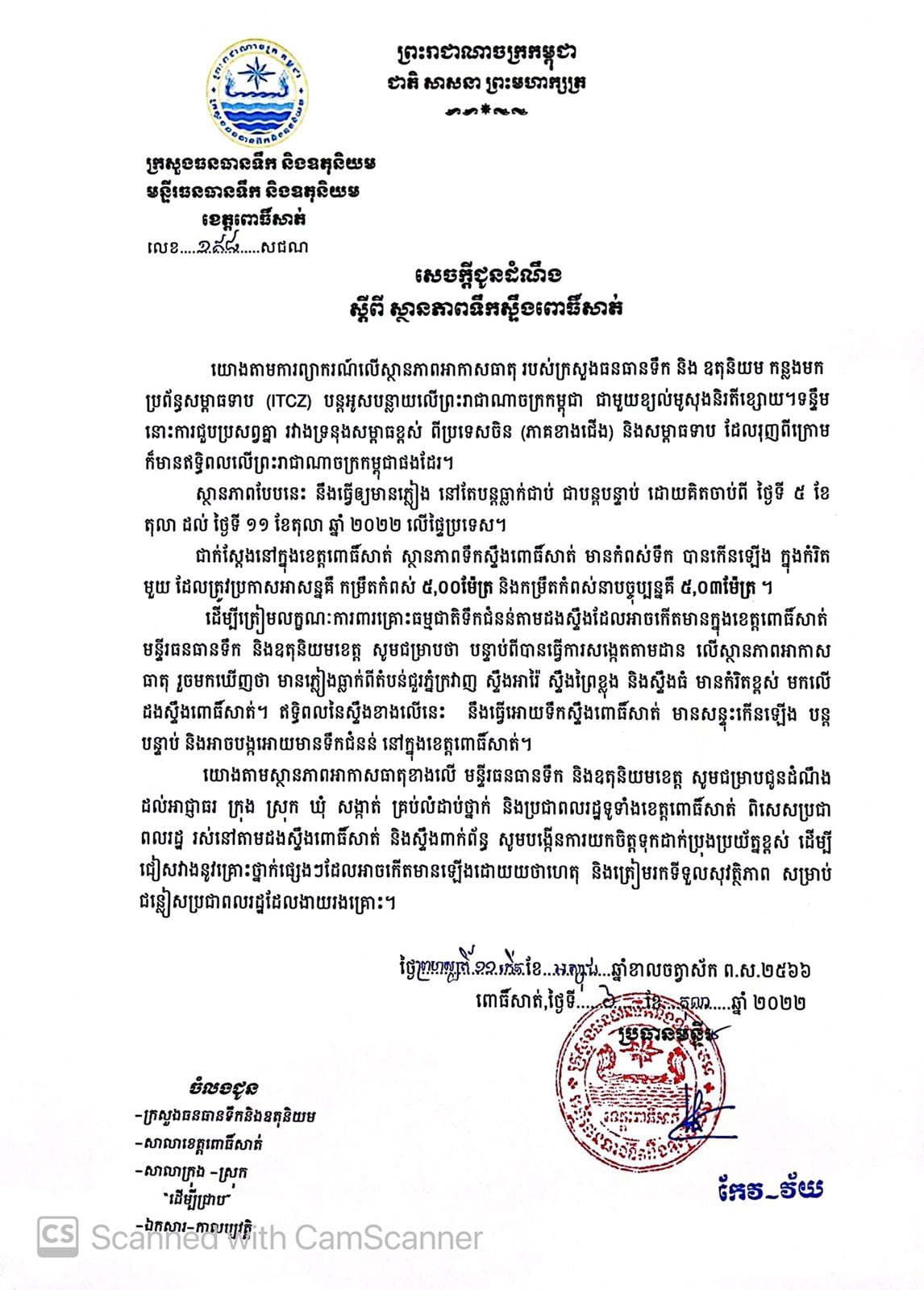 ខេត្តពោធិ៍សាត់៖ យោងតាមការចុះផ្សាយរបស់ ក្រសួងធនធានទឹក និងឧតុនិយម បានឱ្យដឹងថា នៅថ្ងៃទី៦ ខែតុលា ឆ្នាំ២០២២ វេលាម៉ោង ៤៖០០នាទីល្ងាច ទឹកសឹ្ទងពោធិ៍សាត់ បានហក់ឡើងយ៉ាងខ្លាំងដោយមានប្រភពទឹកភ្លៀងតំបន់ជួរភ្នំក្រវាញនៅផ្នែកខាងលើដែលមានកម្រិតកំពស់ដូចខាងក្រោម៖