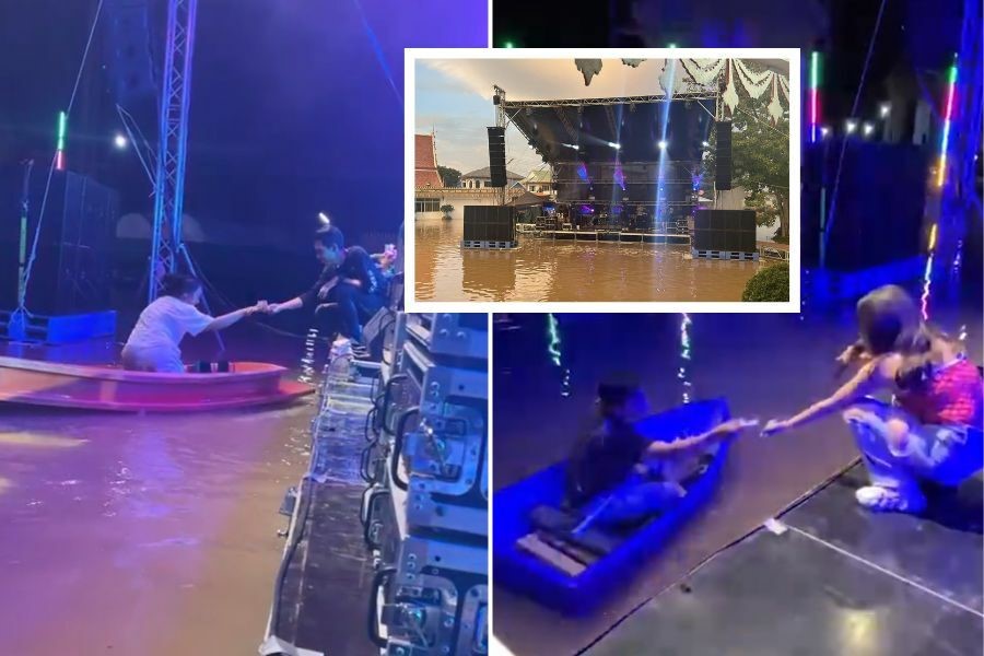 ការប្រគំតន្ត្រីមួយនៅថៃនៅតែបន្តរៀបចំឡើង បើទោះទឹកលិចជុំវិញឆាកអស់ក៏ដោយ ខណៈអ្នកគាំទ្រសុខចិត្តជិះទូកទៅមើល idol ច្រៀង (មានវីដេអូ)