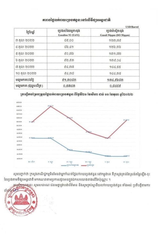មកដឹងពីតម្លៃប្រេងសាំងថ្មី ចាប់ពីថ្ងៃទី១១ ដល់ថ្ងៃទី២០ ខែតុលា