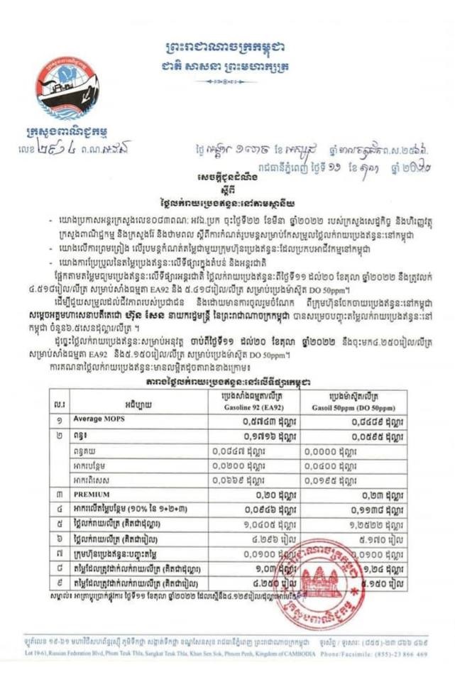 រាជធានីភ្នំពេញ៖ យោងតាមលិខិតរបស់ក្រសួងពាណិជ្ជកម្ម ចុះផ្សាយថ្ងៃទី១១ ខែតុលា ឆ្នាំ២០២២ ស្តីអំពីតម្លៃលក់រាយប្រេងឥន្ធនៈនៅតាមស្ថានីយទាំងអស់ក្នុងព្រះរាជាណាចក្រកម្ពុជាសម្រាប់អនុវត្តទៅតាមតម្លៃមធ្យមប្រេងឥន្ធនៈលើទីផ្សារអន្តរជាតិ ចាប់ពីថ្ងៃទី១១ ដល់ថ្ងៃទី២០ ខែតុលា ឆ្នាំ២០២២ បានឲ្យដឹងថា តម្លៃប្រេងសាំងធម្មតាមានតម្លៃ ៤,២៥០រៀលក្នុងមួយលីត្រ ចំណែកឯប្រេងសាំងម៉ាស៊ូតមានតម្លៃ ៥,១៥០រៀលក្នុងមួយលីត្រប៉ុណ្ណោះ។