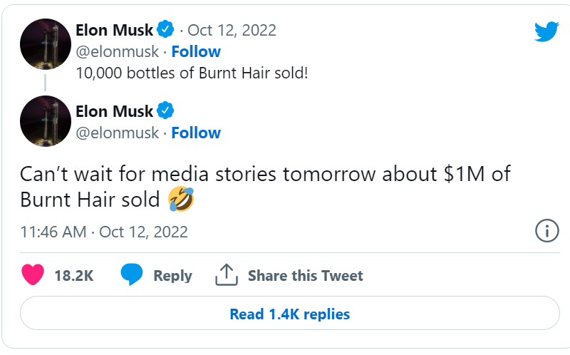 ប្រភពខាងបានបន្តថា ទឹកអប់ម៉ាក “Burnt Hair” ត្រូវបានដាក់លក់ក្នុងតម្លៃ ១០០ដុល្លារសម្រាប់ទីផ្សារនៅសហរដ្ឋអាមេរិក ខណៈនៅតាមបណ្តាប្រទេសមួយចំនួននៅមិនទាន់មានលក់នៅឡើយទេ។ បើយោងតាមសារនៅលើគណនី Twitter ផ្លូវការរបស់លោក លោក Elon Musk ដែលបានបង្ហោះក្រោយពេលដាក់លក់ទឹកអប់បានបន្តិចបានឲ្យដឹងថា មានទឹកអប់ “Burnt Hair” ចំនួន ១០,០០០ ដបត្រូវបានលក់ចេញ ខណៈលោក Elon Musk រំពឹងថា ទឹកអប់ចំនួន ១លានដបនឹងត្រូវលក់ដាច់ក្នុងពេលដ៏ខ្លីខាងមុខផងដែរ៕