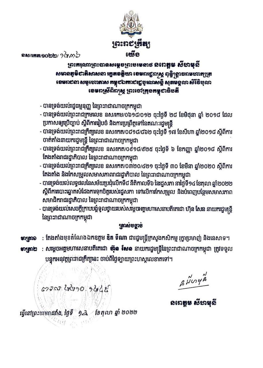 ព្រះមហាក្សត្រ ចេញព្រះរាជក្រឹត្យត្រាស់បង្គាប់តែងតាំង ឯកឧត្តម ឌិត ទីណា ជារដ្ឋមន្រ្តីក្រសួងកសិកម្ម