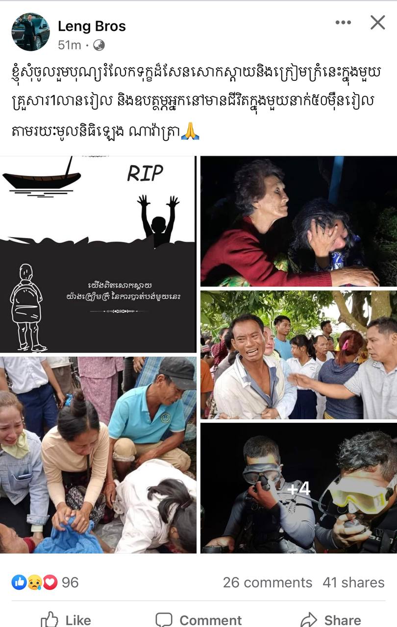 ជាការរំលែកទុក្ខ! លោកឧកញ៉ា ឡេង ប្រុស ចូលរួមឧបត្ថម្ភគ្រួសារសពជនរងគ្រោះម្នាក់១លានរៀល និងអ្នកនៅមានជីវិតម្នាក់៥០ម៉ឺនរៀល ករណីលិចទូកចម្លងនៅខេត្តកណ្តាល