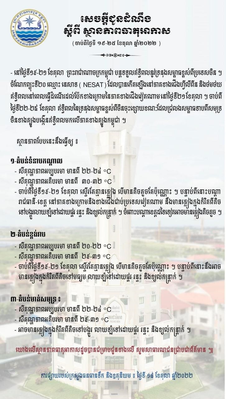 រាជធានីភ្នំពេញ៖ យោងតាមការចុះផ្សាយរបស់ ក្រសួងធនធានទឹក និងឧតុនិយម នៅថ្ងៃទី១៨ ខែតុលា ឆ្នាំ២០២២ បានចេញសេចក្តីជូនដំណឹង ស្តីពីស្ថានភាពអាកាសធាតុនៅកម្ពុជា ចាប់ពីថ្ងៃទី១៩ ដល់ថ្ងៃទី២៥ ខែតុលា ឆ្នាំ២០២២ឱ្យបានជ្រាបថា៖