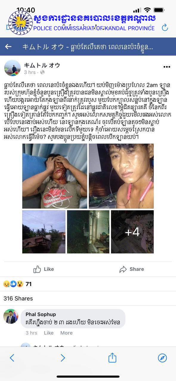 ក្រុមការងារព័ត៌មាននិងប្រតិកម្មរហ័ស នៃស្នងការដ្ឋាននគរបាលខេត្តកណ្តាល សូមឆ្លើយតបបំភ្លឺជូនសាធារណជន ទៅនឹងគណនីហ្វសប៊ុកមួយបានបង្ហោះ ដែលមានខ្លឹមសារថា៖ ធ្លាប់តែលឺគេថាពេលនេះប៉ះចំខ្លួនឯងហើយ។ យប់មិញម៉ោងប្រហែល2am ឡានរបស់ក្រុមហ៊ុនខ្ញុំចំនួនបួនគ្រឿងត្រូវបានជនមិនស្គាល់មុខគប់ដុំថ្មត្រូវទាំងបួនគ្រឿង ហើយបង្កអោយតៃកុងឡានពីរនាក់ត្រូវរបួសបែកក្បាលសន្លប់នៅក្នុងឡាន ធ្វើអោយឡានធ្លាក់ផ្លូវមួយទៀតត្រូវដៃ នៅផ្លូវជាតិលេខ១ ម្តុំផ្សារគគីរ ចំណែកពីរគ្រឿងទៀតគ្រាន់តែបែកកញ្ចក់ ។