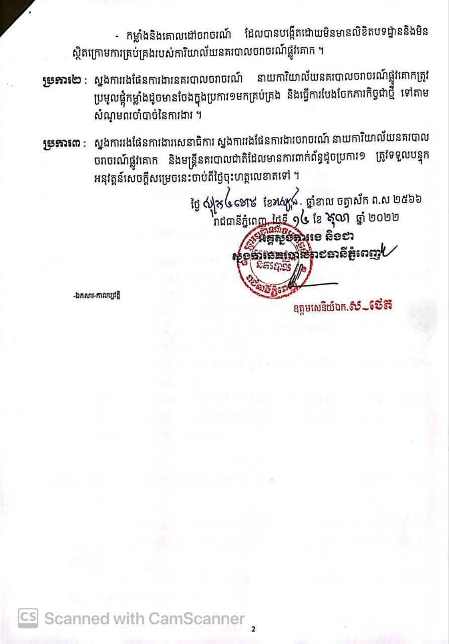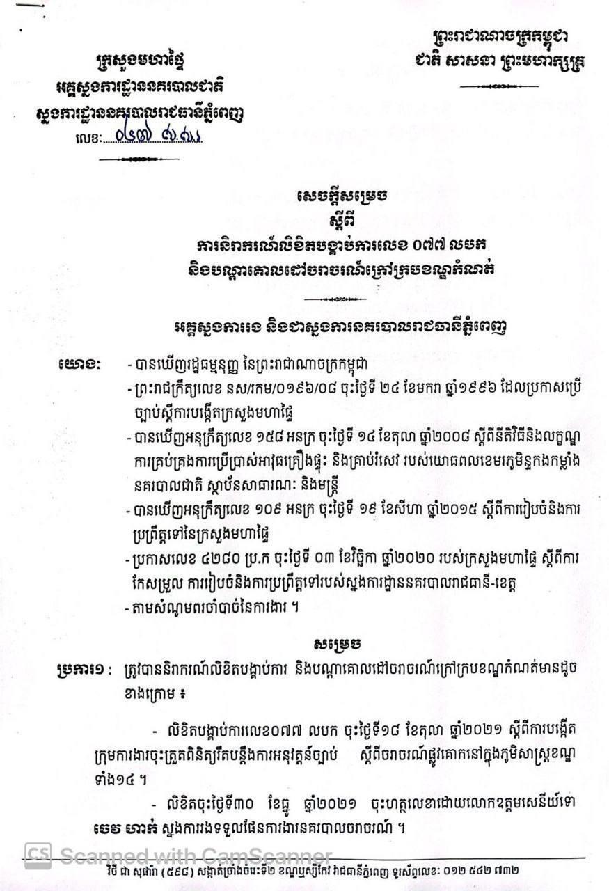 បើយោងតាមសេចក្តីសម្រេច ស្នងការនគរបាលរាជធានីភ្នំពេញគឺសម្រេចនិរាករណ៍លិខិតបង្គាប់ការ លេខ០៧៧ លបក និងបណ្តាគោលដៅចរាចរណ៍ក្រៅក្របខណ្ឌកំណត់ ចុះហត្ថលេខាដោយលោកឧត្តមសេនីយ៍ឯក ស ថេត អគ្គស្នងការរង និងជាស្នងការនគរបាល រាជធានីភ្នំពេញ ចុះថ្ងៃទី១៤ ខែតុលា ឆ្នាំ២០២២ ៕