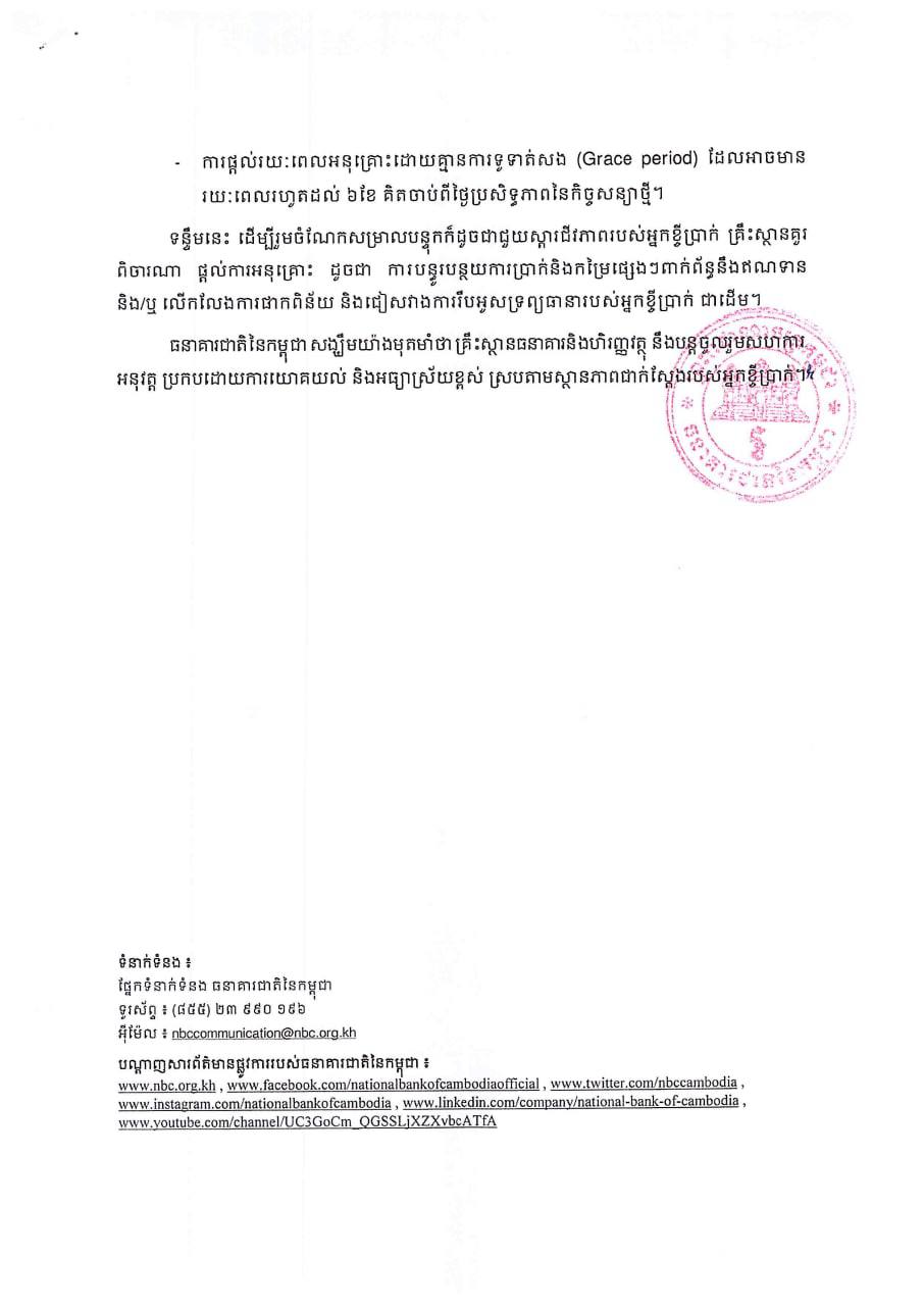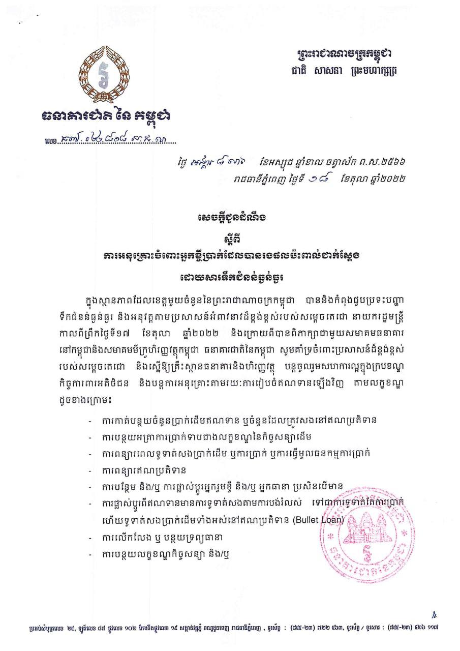 ក្នុងស្ថានភាពដែលខេត្តមួយចំនួននៃព្រះរាជាណាចក្រកម្ពុជា បាននិងកំពុងជួបប្រទះបញ្ហាទឹកជំនន់ធ្ងន់ធ្ងរ និងអនុវត្តតាមប្រសាន៍អំពាវនាវដ៏ខ្ពង់ខ្ពស់របស់សម្តេចតេជោ នាយករដ្ឋមន្ត្រីកាលពីព្រឹកថ្ងៃទី១៧ ខែតុលា ឆ្នាំ២០២២ និងក្រោយពីបានពិភាក្សាជាមួយសមាគមធនាគារនៅកម្ពុជា និងសមាគមមីក្រូហិរញ្ញវត្ថុកម្ពុជា ធនាគារជាតិនៃកម្ពុជា សូមគាំទ្រចំពោះប្រសាសន៍ដ៏ខ្ពង់ខ្ពស់របស់សម្តេចតេជោ និងស្នើឱ្យគ្រឹះស្ថានធនាគារនិងហិរញ្ញវត្ថុ បន្តចូលរួមសហការល្អ ក្នុងក្របខណ្ឌកិច្ចការពារអតិថិជន និងបន្តការអនុគ្រោះតាមរយៈការរៀបចំឥណទានឡើងវីញ តាមលក្ខខណ្ឌដូចខាងក្រោម៖