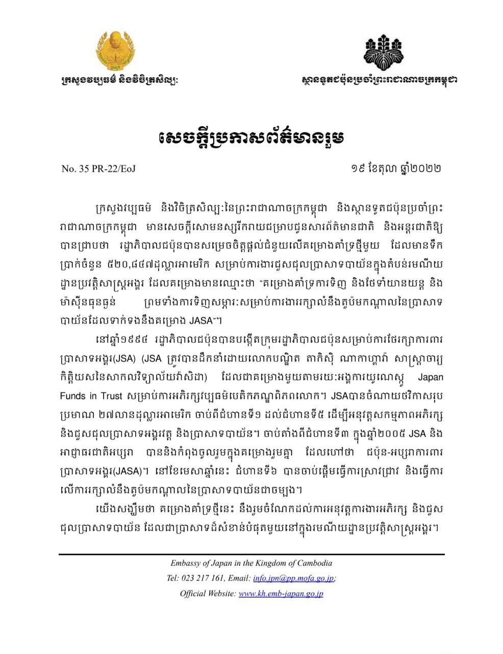 (ភ្នំពេញ)៖ ស្ថានទូតជប៉ុននៅកម្ពុជា នៅយប់ថ្ងៃទី១៩ ខែតុលា ឆ្នាំ២០២២ បានឱ្យដឹងថា រដ្ឋាភិបាលជប៉ុនបានសម្រេចផ្តល់ជំនួយលើគម្រោងថ្មីមួយដែលមានទឹកប្រាក់ចំនួន ៥២០,៨៤៧ដុល្លារអាមេរិកសម្រាប់ការងារជួសជុលប្រាសាទបាយ័នក្នុងតំបន់រមណីយដ្ឋានប្រវត្តិសាស្រ្តអង្គរ។
