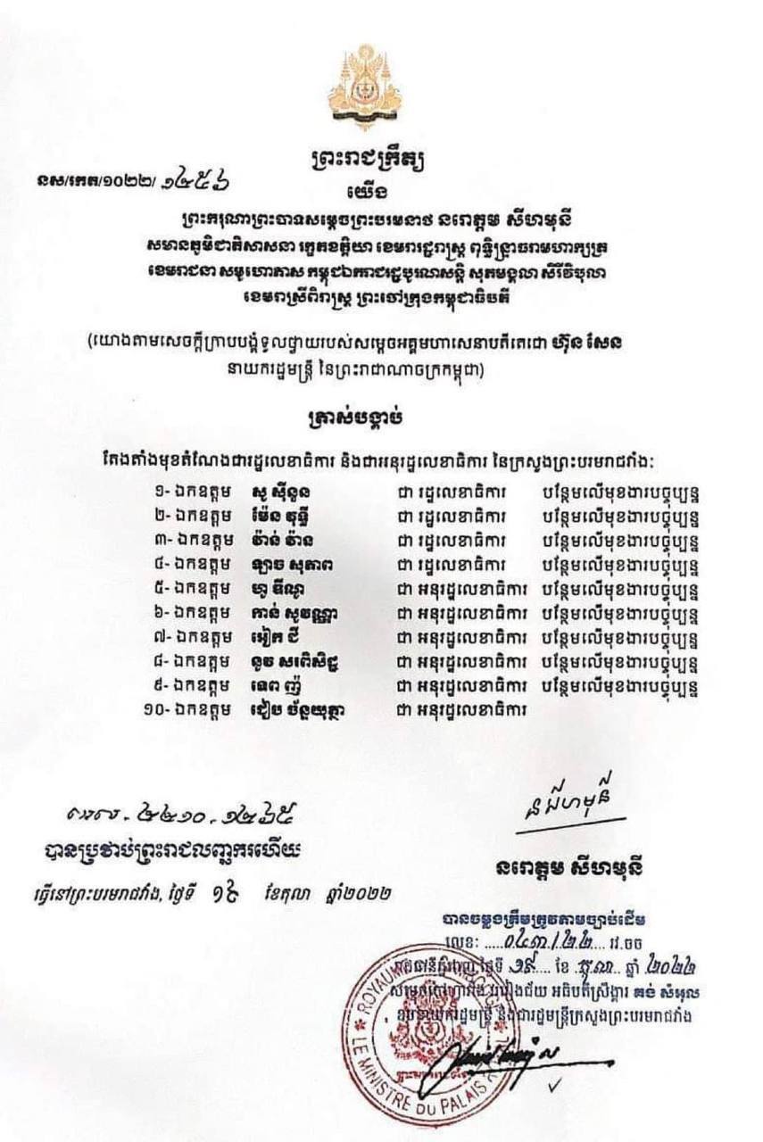 ព្រះមហាក្សត្រ ចេញព្រះរាជក្រឹត្យតែងតាំង រដ្ឋលេខាធិការ និងអនុរដ្ឋលេខាធិកាចំនួន ១០រូប នៃក្រសួងព្រះបរមរាជវាំង