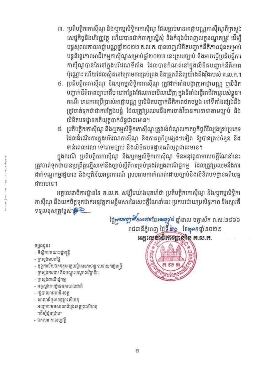 រាជធានីភ្នំពេញ យោងតាមការចុះផ្សាយរបស់ អគ្គលេខាធិការដ្ឋាន នៃគណៈកម្មការគ្រប់គ្រងល្បែងពាណិជ្ជកម្មកម្ពុជា នៅថ្ងៃទី២០ ខែតុលា ឆ្នាំ២០២២ បានចេញសេចក្តីណែនាំ ស្តីពីការគ្រប់គ្រងប្រតិបត្តិការកាស៊ីណូ នៅព្រះរាជាណាចក្រកម្ពុជា។