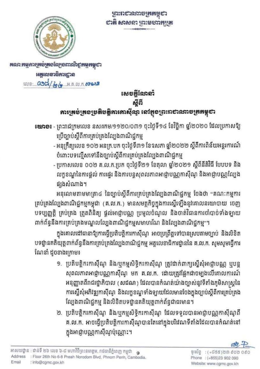 ក្នុងគោលដៅធានាឱ្យការធ្វើប្រតិបត្តិការកាស៊ីណូ អាចប្រព្រឹត្តទៅបានស្របតាមច្បាប់ និងលិខិតបទដ្ឋានគតិយុត្តពាក់ព័ន្ធ នឹងការគ្រប់គ្រងល្បែងពាណិជ្ជកម្ម អគ្គលេខាធិការដ្ឋាននៃ គ.ល.ក សូមធ្វើការណែនាំដូចខាងក្រោម៖