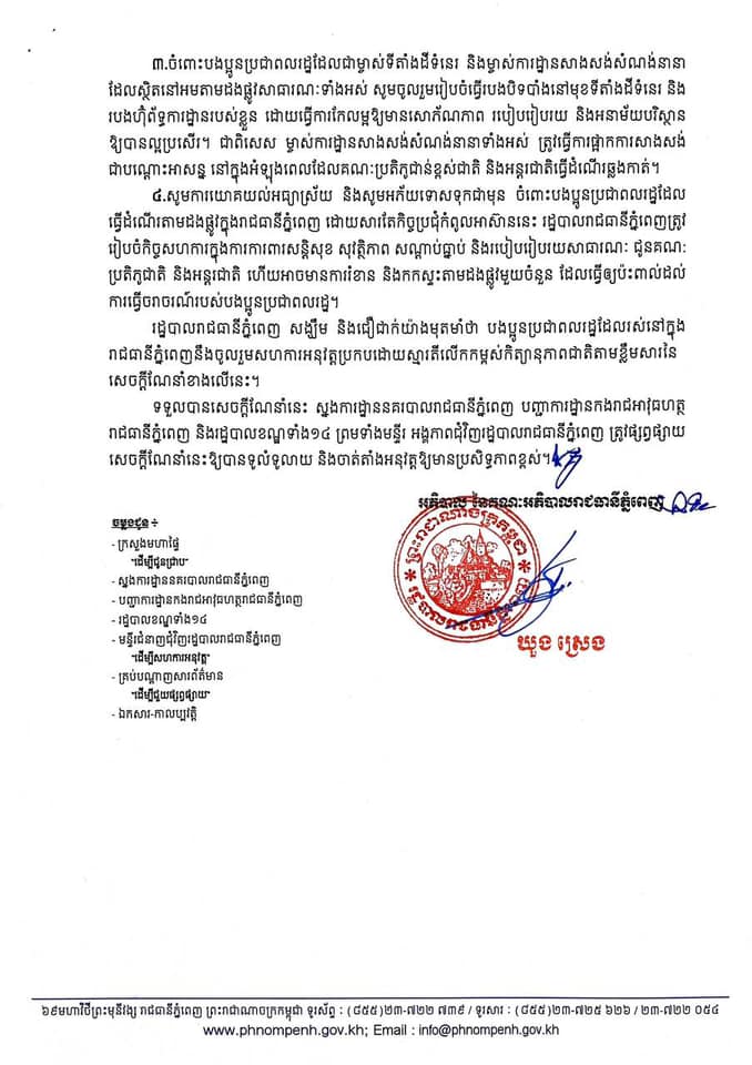 ដើម្បីឱ្យកិច្ចដំណើរការនៃការរៀបចំកិច្ចប្រជុំកំពូលអាស៊ាន និងកិច្ចប្រជុំកំពូលពាក់ព័ន្ធនានា ឱ្យប្រព្រឹត្តទៅដោយភាពរលូន និងទទួលបានជោគជ័យ រដ្ឋបាលរាជធានីភ្នំពេញ សូមសំណូមពរដល់បងប្អូនប្រជាពលរដ្ឋ ដែលរស់នៅក្នុងរាជធានីភ្នំពេញ មេត្តាចូលរួមអនុវត្តតាមការណែនាំដូចខាងក្រោម៖