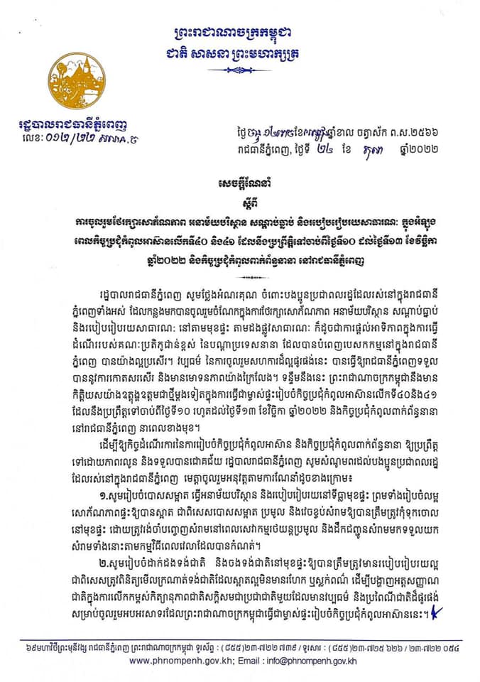 រាជធានីភ្នំពេញ៖ យោងតាមការចុះផ្សាយរបស់ រដ្ឋបាលរាជធានីភ្នំពេញ នៅថ្ងៃទី២៤ ខែតុលា ឆ្នាំ២០២២ បានចេញសេចក្ដីណែនាំ ស្ដីពីការចូលរួមថែរក្សាសោភ័ណភាព អនាម័យបរិស្ថាន សណ្ដាប់ធ្នាប់ និងរបៀបរៀបរយសាធារណៈ ក្នុងអំឡុងពេលកិច្ចប្រជុំកំពូលអាស៊ានលើកទី៤០ និង៤១ ដែលនឹងប្រព្រឹត្តិទៅចាប់ពីថ្ងៃទី១០ ដល់ថ្ងៃទី១៣ ខែវិច្ឆិកា ឆ្នាំ២០២២ និងកិច្ចប្រជុំកំពូលពាក់ព័ន្ធនានា នៅរាជធានីភ្នំពេញ។