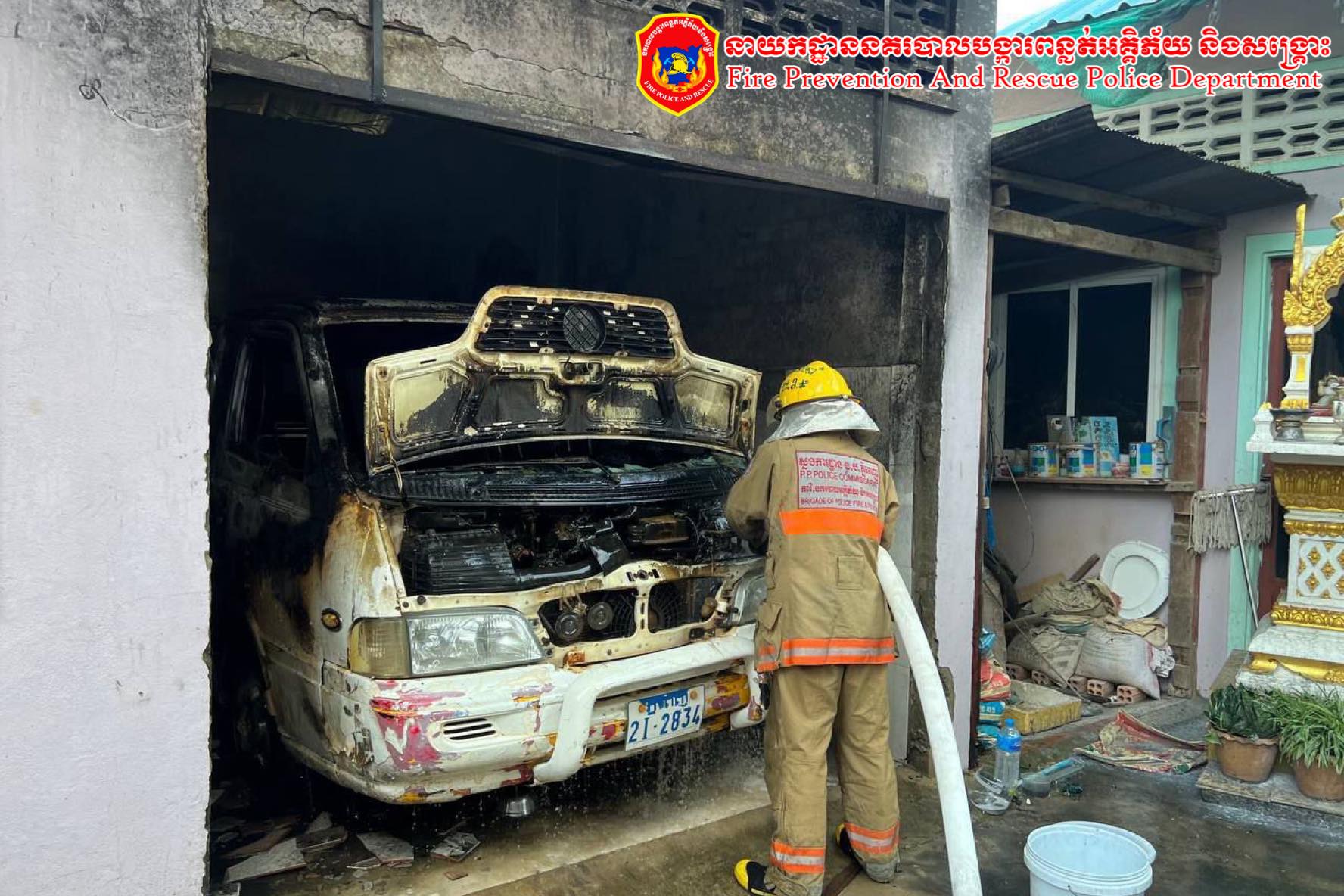 រាជធានីភ្នំពេញ៖ យោងតាមការចុះផ្សាយរបស់ នាយកដ្ឋាននគរបាលបង្ការពន្លត់អគ្គិភ័យនិងសង្គ្រោះ បានឱ្យដឹងថា នៅវេលាម៉ោង ១៣៖៣០ នាទីថ្ងៃត្រង់ ថ្ងៃអង្គារ ១កើត ខែកតិ្តកឆ្នាំខាល ចត្វាស័ក ព.ស ២៥៦៦ ត្រូវនឹងថ្ងៃទី២៥ ខែតុលាឆ្នាំ២០២២ មានករណីអគ្គិភ័យឆេះរថយន្តមួយគ្រឿងបានកើតឡើងនៅចំណុច ផ្ទះលេខ២៨៧អា ផ្លូវលំ ក្រុមទី០៦ ភូមិចុងថ្នល់ខាងលិច សង្កាត់ទឹកថ្លាខណ្ឌសែនសុខ រាជធានីភ្នំពេញ ម្ចាស់ឈ្មោះ ហុង ប៊ុនរឿន ភេទ ប្រុស អាយុ ៥៣ឆាំ្ន ជនជាតិខែ្មរ មុខរបរ នគរបាល។