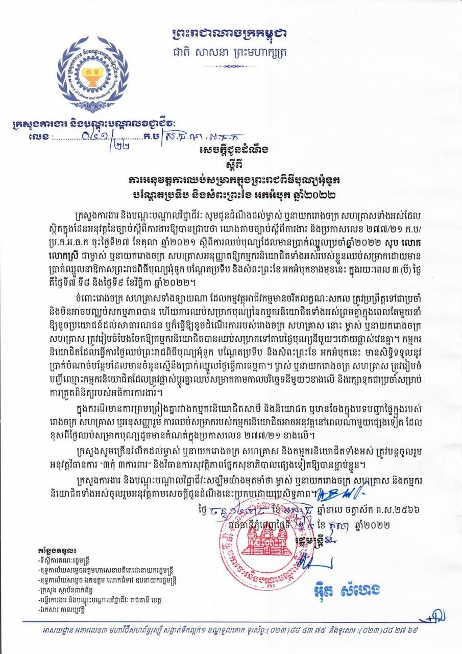 ក្រសួងការងារ អនុញ្ញាតឱ្យឈប់សម្រាករយៈពេល ៣ថ្ងៃ ចាប់ពីថ្ងៃទី០៧-០៩ ខែវិច្ឆិកា ក្នុងឱកាសព្រះរាជពិធីបុណ្យអុំទូក ឆ្នាំ២០២២