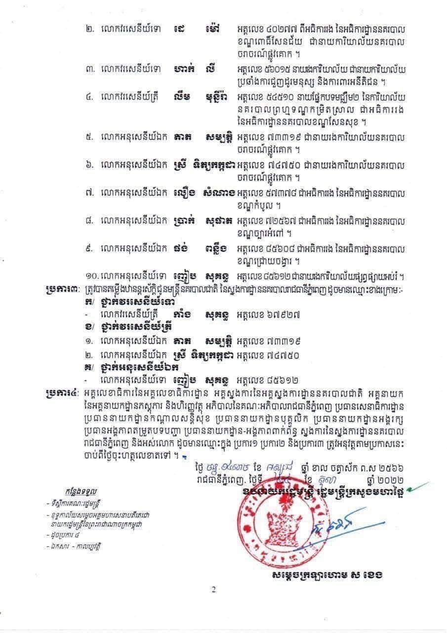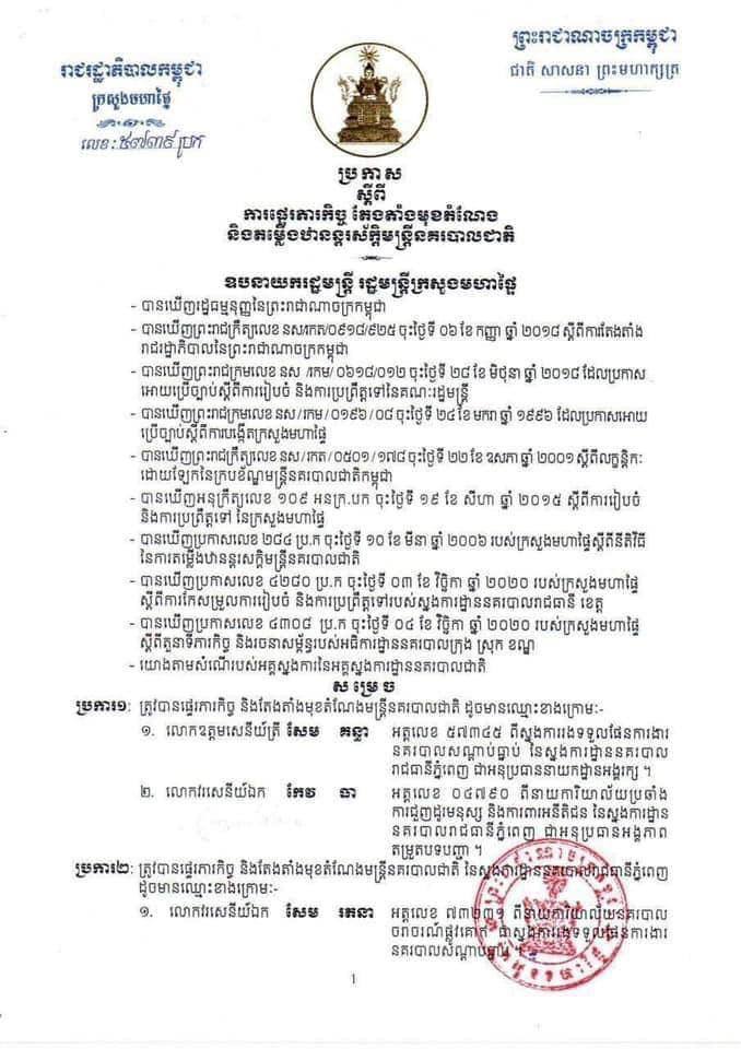 ឧបនាយករដ្ឋមន្រ្តី រដ្ឋមន្ត្រីក្រសួងមហាផ្ទៃ ត្រូវបានផ្ទេរភារកិច្ច និងតែងតាំងមុខតំណែងមន្ត្រីនគរបាលជាតិ ដូចមានឈ្មោះខាងក្រោម៖
