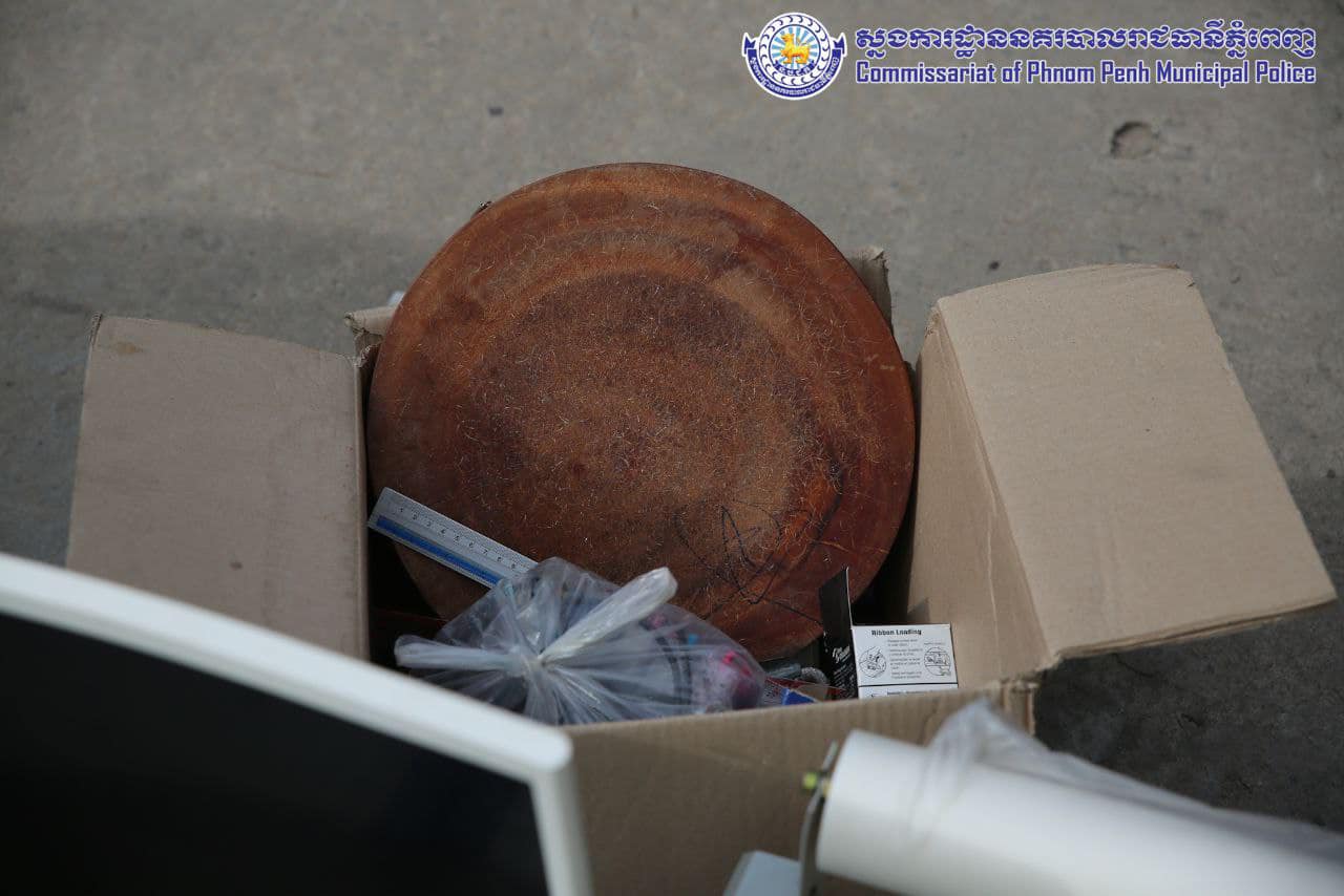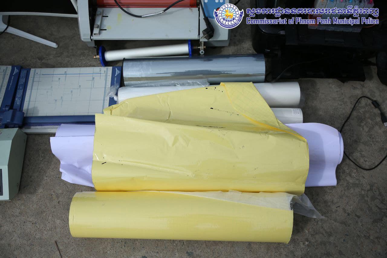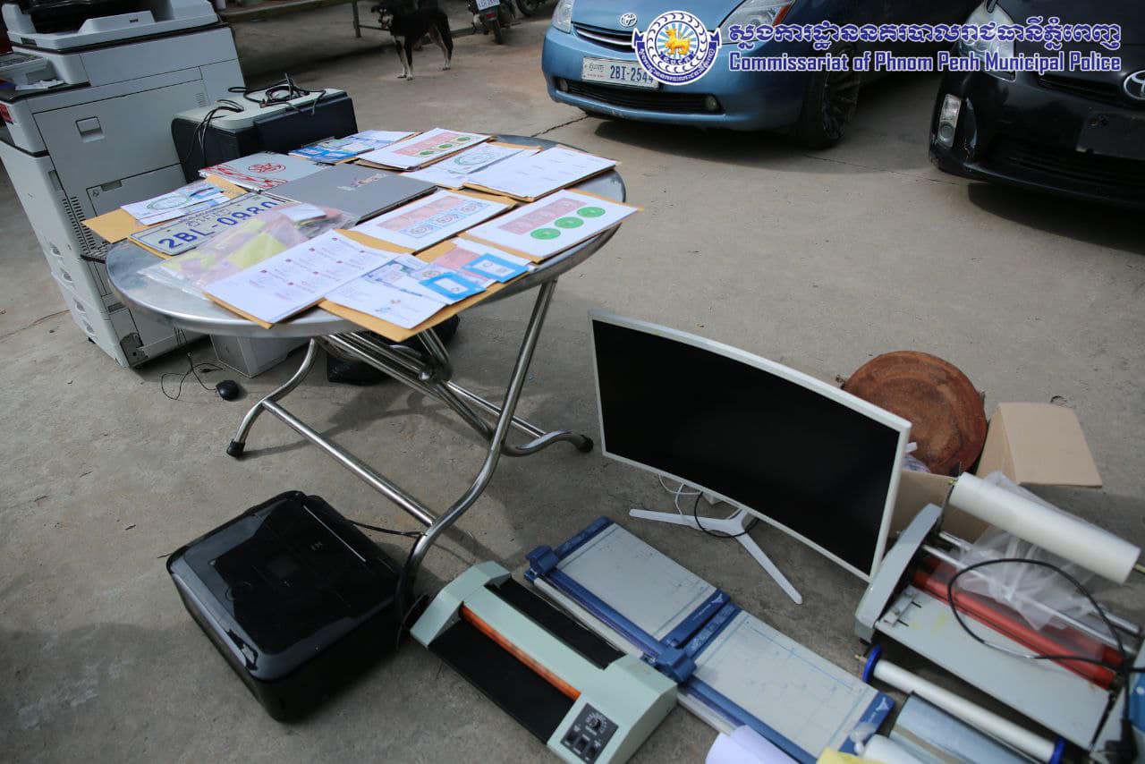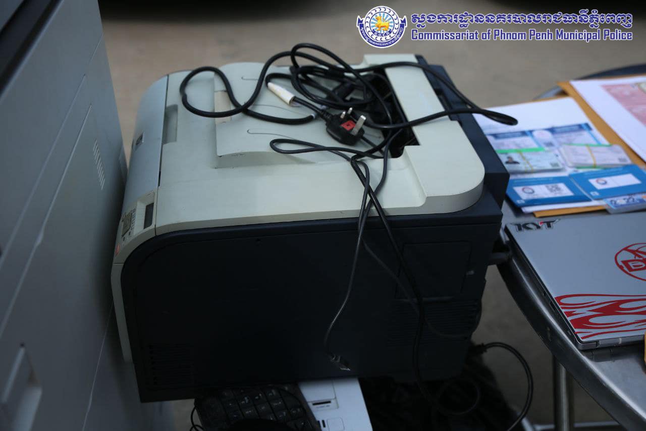 ម៉ាស៊ីនព្រីនធឺចំនួន០៣ គ្រឿង ម៉ាកCanon ពណ៌ខ្មៅ, កុំព្យូទ័រឡេបថប ចំនួន០២គ្រឿង ម៉ាកAcer ពណ៌ ទឹកប្រាក់, ម៉ូនីទ័រចំនួន០១គ្រឿង ម៉ាកSamsung, CPU ចំនួន០១គ្រឿងម៉ាក Super Silent ពណ៌ស, ឃីបត ពណ៌ ខ្មៅ ចំនួន០១, ម៉ាស៊ីនព្រីនធឺ ម៉ាកHP ពណ៌ ខ្មៅ ស ចំនួន០១គ្រឿង, ម៉ាស៊ីនថតចម្លង ម៉ាក RICOH ពណ៌ ស ចំនួន០១គ្រឿង, ម៉ៅចំនួន០២គ្រឿង, ម៉ាស៊ីនអ៊ុតផ្លាស្ទីក ម៉ាកLAMINATOR ពណ៌ ប្រផេះ ចំនួន០១គ្រឿង, ម៉ាស៊ីនអ៊ុតកំដៅម៉ាកTEMPERATURE ចំនួន០១គ្រឿង, ប្រដាប់កាត់ក្រដាស ពណ៌ប្រផេះ ចំនួន០១, ស្ទីកឃើសម្រាប់បិទ ពណ៌ ស ចំនួន០១ដុំ, ស្ទីកឃើសម្រាប់បិទ ពណ៌ លឿង ចំនួន០១ដុំ, ស្កុតស្ទីកឃើសម្រាប់បិទ ពណ៌ ស ចំនួន០១ដុំ, ផ្លាស្ទីកសម្រាប់បិទកាត ពណ៌ ស ចំនួន០៣ដុំ, ថង់ ពណ៌ មាស សម្រាប់ធ្វើកាត ចំនួន០១ដុំ(តូច) , ស្ទីកឃើក្រដាសចម្រុះមួយចំនួន, ជ្រុញចំនួន០១, ឧបករណ៍សម្រាប់ធ្វើកាតមួយចំនួន, ម៉ាញែត (លតាបត្ររថយន្តទេសចរណ៍) ក្លែងក្លាយពាក់កណ្តាលសម្រេច ចំនួន១២៤សន្លឹក, ម៉ាញែត (លតាបត្ររថយន្តដឹកជញ្ជូន) ៕