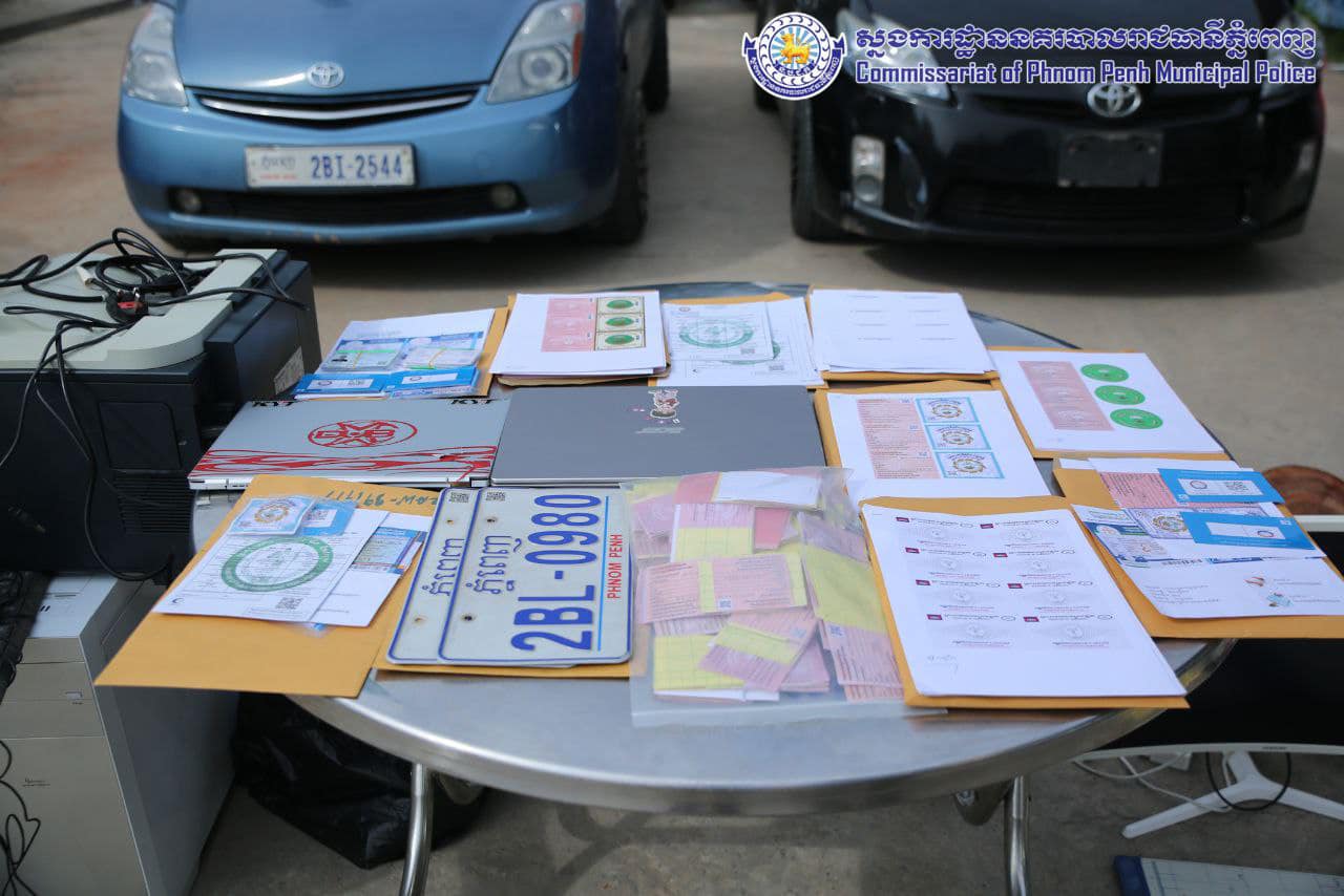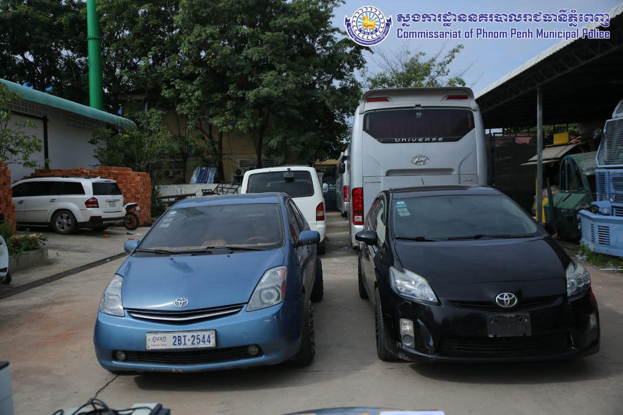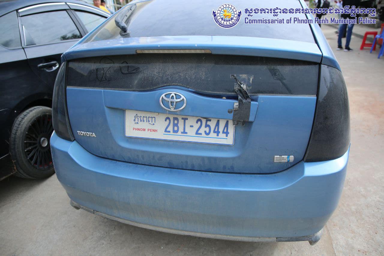 វត្ថុតាងចាប់យក៖ រថយន្តម៉ាកតូយ៉ូតាកាមរី ពណ៌ បៃតងចាស់ សេរីឆ្នាំ១៩៩៧ ពាក់ផ្លាកលេខ ភ្នំពេញ២ B ៨៦៧៨ ចំនួន ០១គ្រឿង, ប័ណ្ណសម្គាល់យានយន្តផ្លាកលេខ ភ្នំពេញ២B ៨៦៧៨ ចំនួន០១សន្លឹក និងផ្លាកលេខរថយន្ត ភ្នំពេញ២BL០៩៨០ ចំនួន០២ផ្ទាំង, ទូរស័ព្ទដៃម៉ាកអាយហ្វូន១១ ចំនួន០១គ្រឿង, ទូរសព្ទ័ម៉ាកអាយហ្វូន១១ប្រូម៉េកចំនួន០១គ្រឿង, រថយន្តម៉ាកតូយ៉ូតាព្រូស ពណ៌ខ្មៅ សេរីឆ្នាំ២០១០ ពាក់ផ្លាកលេខ ភ្នំពេញ ២BL០៩៨០ ចំនួន០១គ្រឿង។