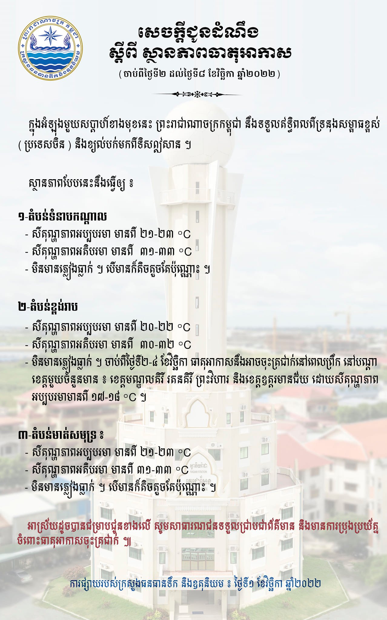 រាជធានីភ្នំពេញ៖ យោងតាមការចុះផ្សាយរបស់ ក្រសួងធនធានទឹក និងឧតុនិយម នៅថ្ងៃទី០១ ខែវិច្ឆិកា ឆ្នាំ២០២២ បានសេចក្ដីជូនដំណឹងស្ដីពីស្ថានភាពធាតុអាកាស ចាប់ពីថ្ងៃទី០២ ដល់ថ្ងៃទី០៨ ខែវិច្ឆិកា ឆ្នាំ២០២២ ឱ្យបានជ្រាបថា៖